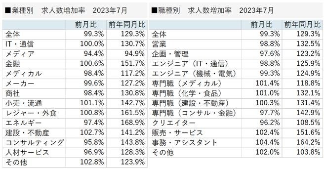 2023年7月の転職求人倍率は、前月から+0.03ポイントの2.29倍となりました。求人数は前月比99.3%、前年同月比129.3%となりました。転職希望者数は前月比98.0%、前年同月比112.0%でした。