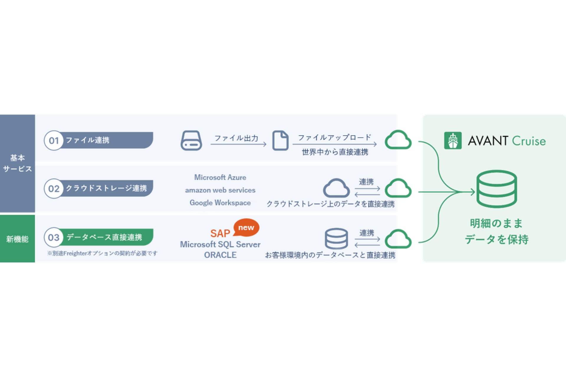 グループ経営に必要なデータの収集を、より早く簡単に行うことを目的としたデータ連携サービス「Freighter」は、システム連携機能(I/F)の開発を必要とせず、お客様の環境内にあるシステムデータソースやファイルサーバーとAVANT Cruiseを直接結びつけることが可能です。