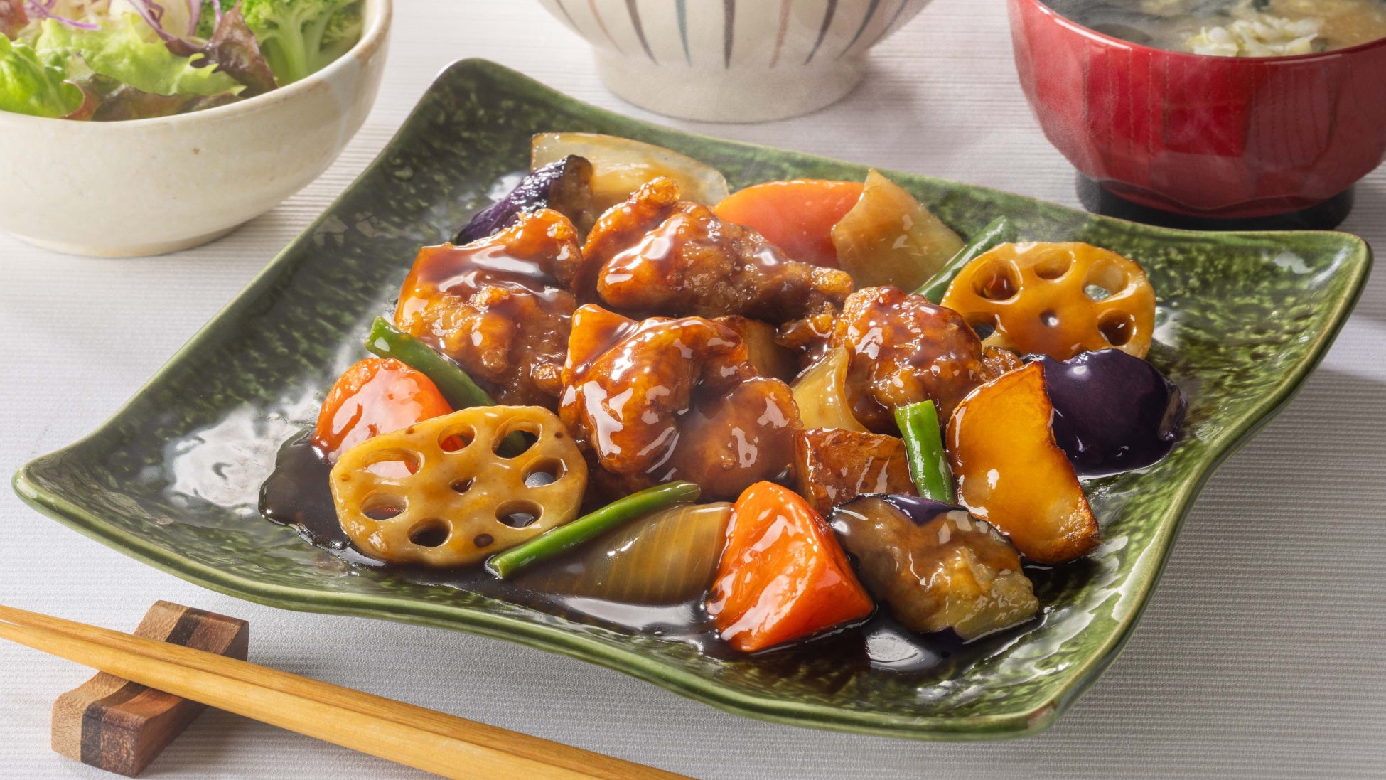 不動の⼈気No.1メニュー!⽞⽶黒酢と黒糖に、りんご酢で味を調えた、⼤⼾屋オリジナルの黒酢あん。