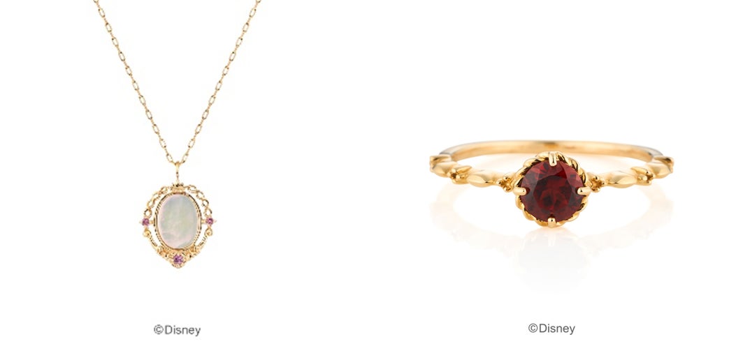 女王が「この世で1番美しいのは誰?」と問いかける魔法の鏡を、白蝶貝で表現したゴージャスなネックレスや、魔女に変装した女王が白雪姫の元に持ってくる、毒リンゴが入ったバスケットをイメージしたリング。リングの裏面には毒リンゴのマークを石座に隠し入れるなど、細かい遊び心も魅力です。
