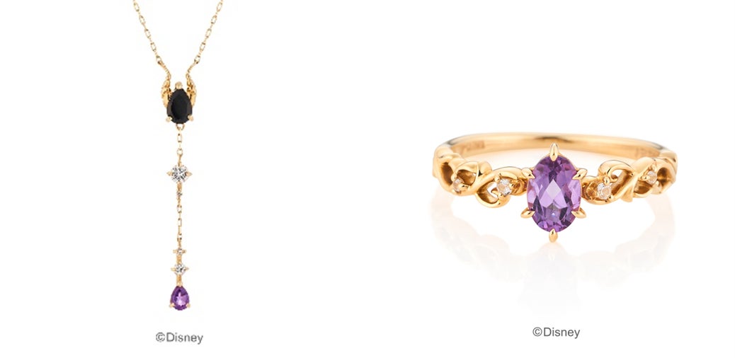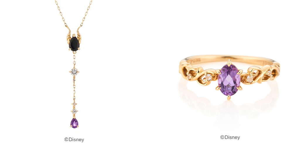 マレフィセントの特徴的な角をイエローゴールドの地金のカラーとブラックのカルセドニーでビビットに表現したネックレスや、マレフィセントが住むいばらの森をイメージした地金のラインが美しいリングも登場。マレフィセントのブラックとパープルの装いに着想を得て、アメシストをセッティングしたジュエリーは、ヴィランズのファンにはたまらない隠れたこだわりが詰まっています。