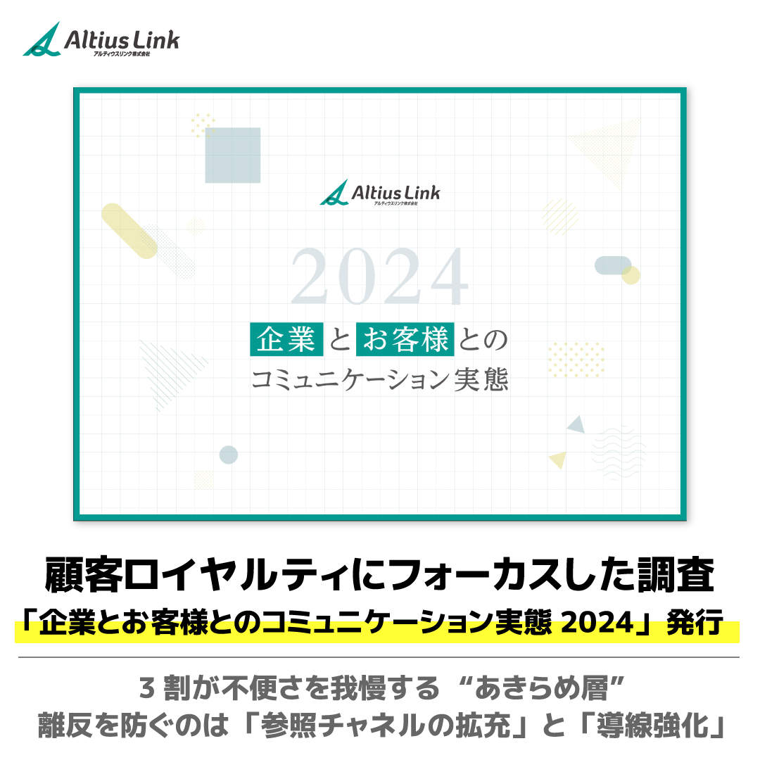 アルティウスリンク株式会社(所在地:東京都渋谷区、代表取締役社長:網野 孝、以下 アルティウスリンク)は、「自分で選定・購入・利用している商品・サービス」がある20~79歳の男女3,714人を対象とした「消費者のペイン(困りごと)発生時の行動と購買行動における嗜好」をテーマにした消費者調査『企業とお客様とのコミュニケーション実態2024年版』を2024年11月18日に発表しました。