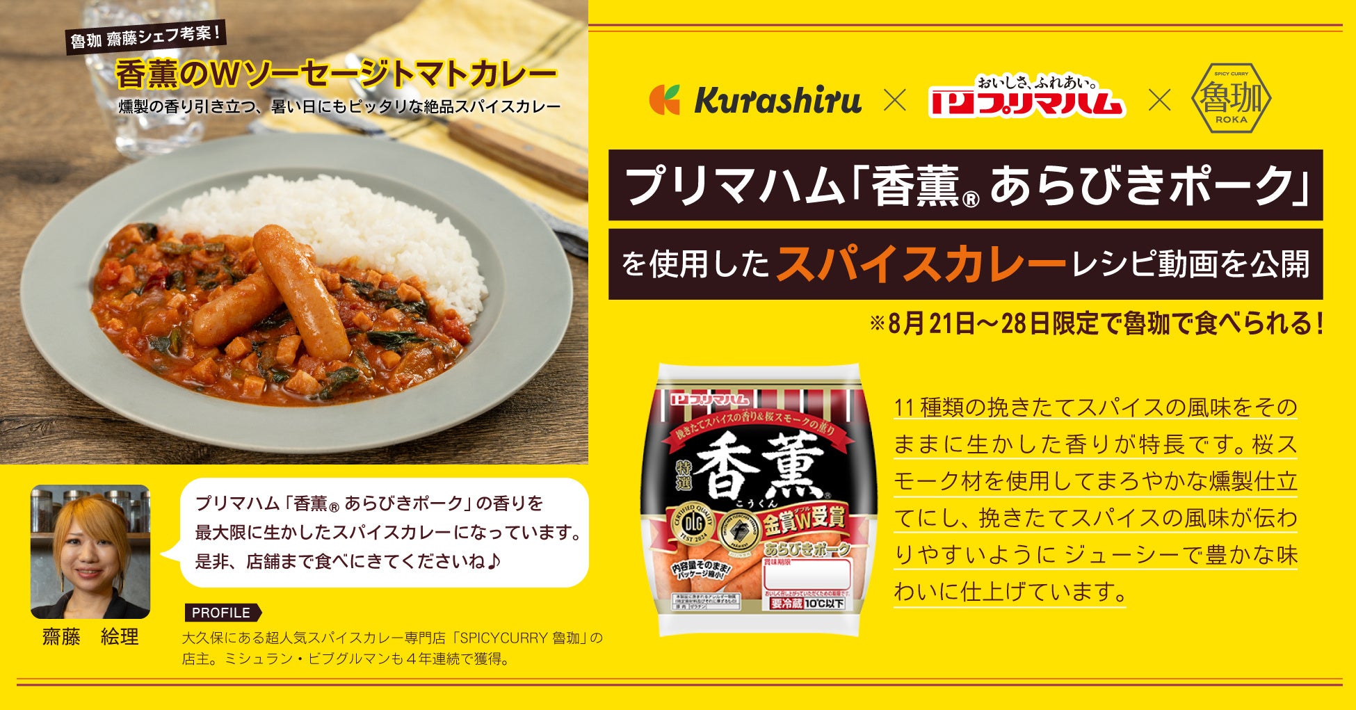国内No.1のレシピ動画「クラシル」とビブグルマン獲得の「SPICY CURRY魯珈」 齋藤絵理シェフがプリマハム「香薫®︎あらびきポーク」の香りを生かしたカレーレシピを開発 1週間限定で実店舗販売も