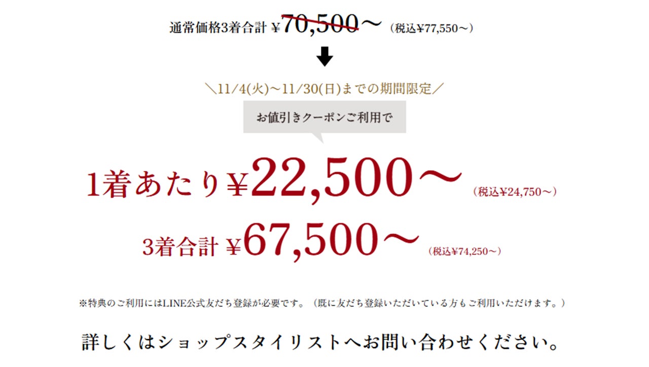 【新店OPEN記念・第2弾】グローバルスタイルが、本日から11月30日(日)まで全店舗対象のフェアを開催!対象プランのご利用で本格オーダースーツが1着あたり23,000円~(税込25,300円~)