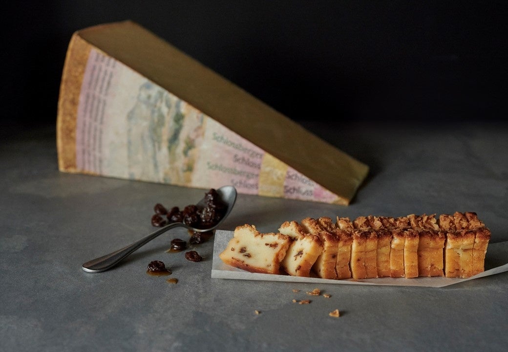 シュロスバーガー アルトは、放牧された牛のミルクがふんだんに使われており、ミルクのコクとしっかりとした旨味、熟成によるナッツのような香りが特徴のチーズです。そんなシュロスバーガー アルトに、相性の良いラム酒漬けレーズンを合わせてチーズケーキを焼き上げました。表面にはフィアンティーヌ(クレープ風の薄焼き菓子)をトッピングし、シュロスバーガー アルトのチーズの側面を再現。約7mmの厚さにカットした仕様にすることで、食べたい分だけ少しずつお召し上がりいただけます。