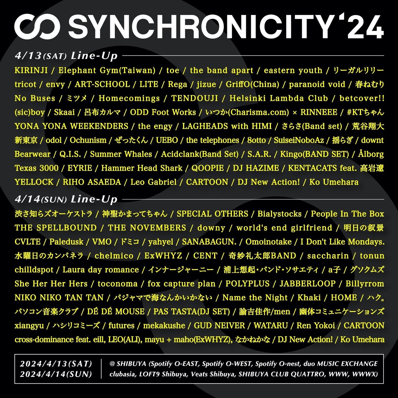 『SYNCHRONICITY’24』出演アーティストから、4/13(土)は、新東京、YONA YONA WEEKENDERS、EYRIE、jizue、odolの5組、4/14(日)に、ExWHYZ、toconoma、DÉ DÉ MOUSE、fox capture plan、グソクムズ、xiangyuの6組の合計11組が出演。また、4/14(日)には、オーガナイザートークとして、主催者の麻生潤(SYNCHRONICITY)を始め、飯田仁一郎(ボロフェスタ)、野口純一(結いのおと)、野村優太(ONE MUSIC CAMP)が出演し、フェス裏側のトークセッションが行われる。MCはフェスティバルライフ編集長の津田昌太朗をメインに、Voicyの番組「ロッキンボイシー」パーソナリティのおりえってぃがサポート。音楽に加え、アーティストの生トークが楽しめる貴重な機会をお届けします。