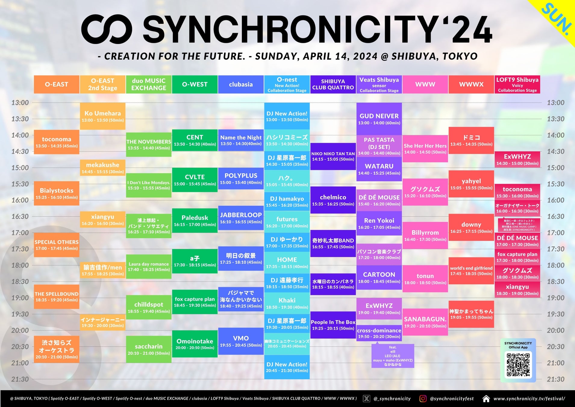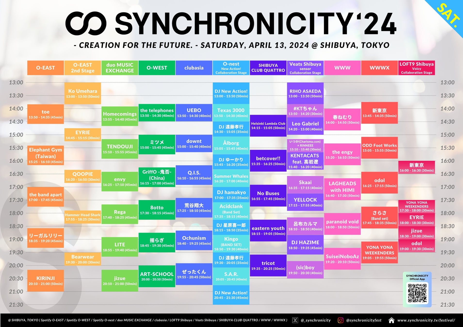『SYNCHRONICITY』は、「CREATION FOR THE FUTURE – 未来が見えるフェスをつくる -」をテーマに、渋谷のライブハウスを中心に、近隣の飲食店やショップも参加する地域一体型の都市型ミュージック&カルチャーフェスティバル。音楽、ライブペインティング、映像、ダンスパフォーマンス、デザイン等、ジャンルを超え様々なアートが交わる空間を通して、未来へ続く前向きなエネルギーを生み出すことを目的に開催しています。https://synchronicity.tv/festival/