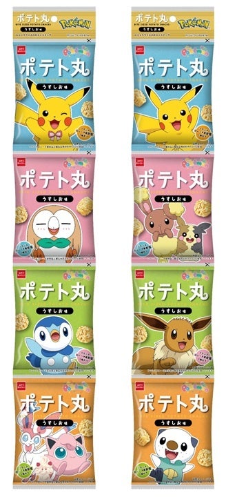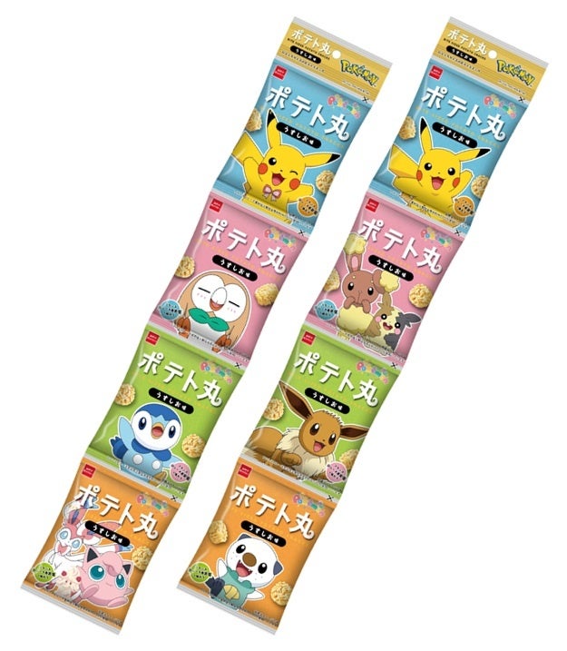 コロコロッと丸くてかわいいひとくちサイズの「ポテト丸」のパッケージに、ピカチュウをはじめ、モクローやポッチャマなどのおなじみのポケモンが登場。さぁ、お気に入りのポケモンパッケージを選んで、春のおでかけを楽しもう!!