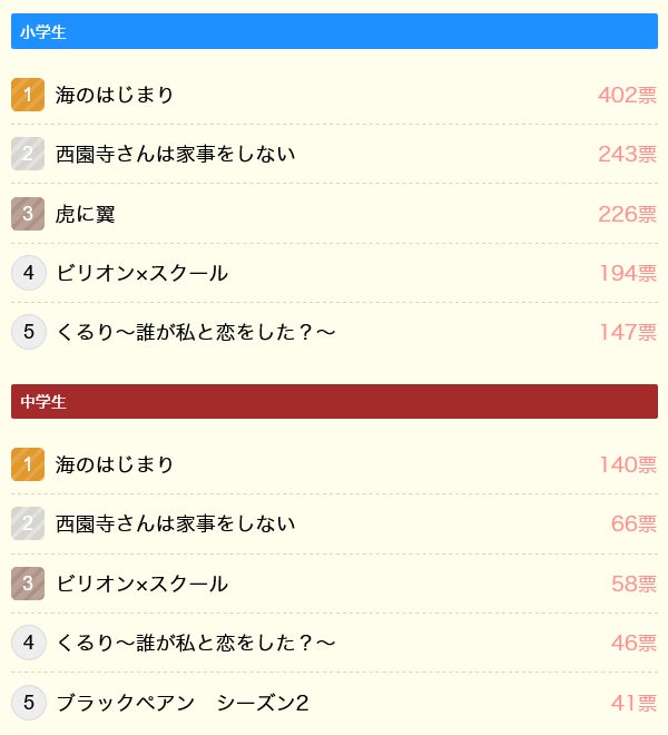 一番はまった今年のドラマは『海のはじまり』がトップでした。小中学生ともに『西園寺さんは家事をしない』や『ビリオン×スクール』、『くるり~誰が私と恋をした?~』が上位に入っています。