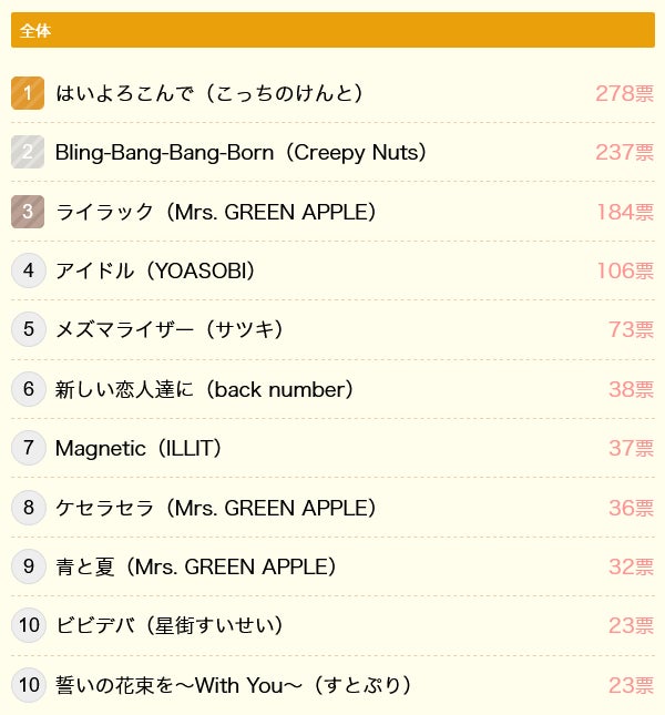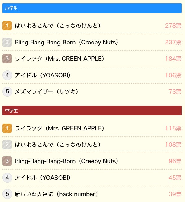 小中学生全体の1位は「はいよろこんで」(こっちのけんと)、2位は「Bling-Bang-Bang-Born」(Creepy Nuts)、3位は「ライラック」(Mrs. GREEN APPLE)で、この上位3曲は、順位は多少異なるものの小中学生別に見ても同様の結果となりました。