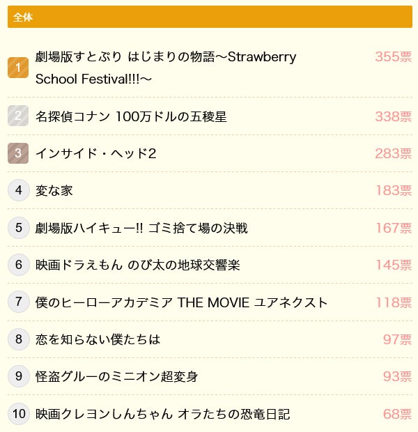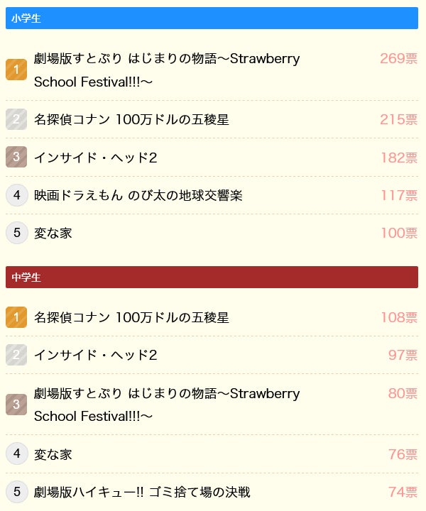 小学生は『劇場版すとぷり はじまりの物語 ~Strawberry School Festival!!!~』、中学生は『名探偵コナン 100万ドルの五稜星』が1位でした。『劇場版すとぷり はじまりの物語 ~Strawberry School Festival!!!~』は、2.5次元アイドル「すとぷり」初となるアニメ映画で、ランクインしている作品の8割がアニメ作品となりました。