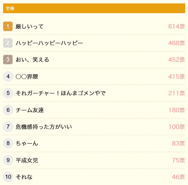 どちらのランキングでも1位となったのは「厳しいって」でした。1位の「厳しいって」と7位の「危機感持った方がいい」は、どちらもYouTuberであるメンズコーチ・ジョージの動画が元ネタとされています。その他にもSNSで話題となった動画から生まれた言葉が多くランクインしました。