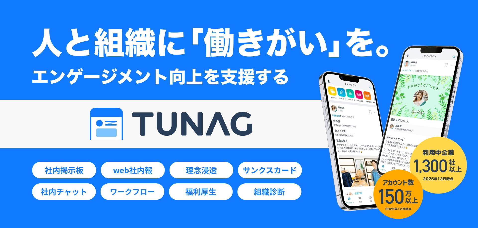 TUNAG(ツナグ)は、組織の生産性向上や離職率の低下を目的とし、社内コミュニケーションと情報共有を促進する統合型プラットフォームです。2025年12月時点で、利用中企業数は1,200社、利用ユーザー数は150万人を突破しています。
