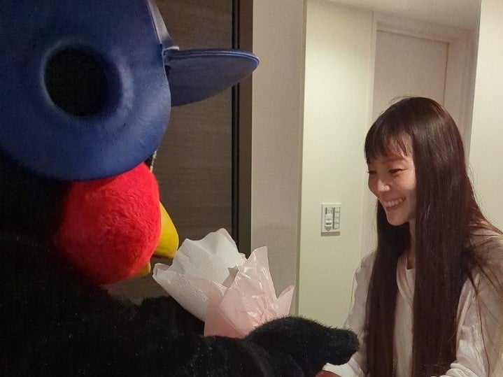 つば九郎の訪問に大感激のK様!つば九郎からは、2023年のシーズンチケットと花束、そしてお祝いのメッセージが贈られました。最後にはK様のご希望で、つば九郎から玄関の鏡にサインとメッセージもプレゼント。K様も「すっかりファンになりました」と終始笑顔のご様子で、とても和やかで温かい入居祝いとなりました。