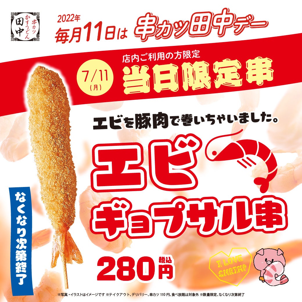 毎月11日は「串カツ田中デー」7月はエビを豚肉で巻いた「エビギョプサル串」!!
