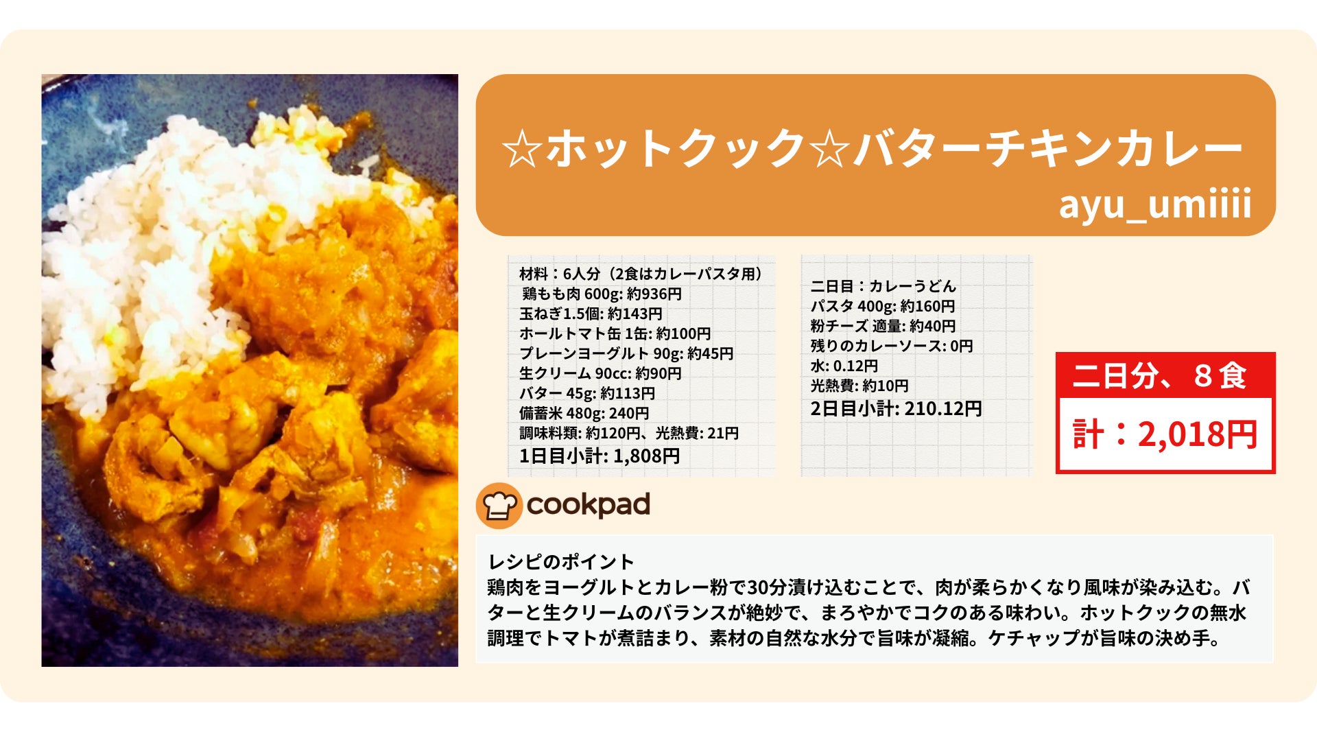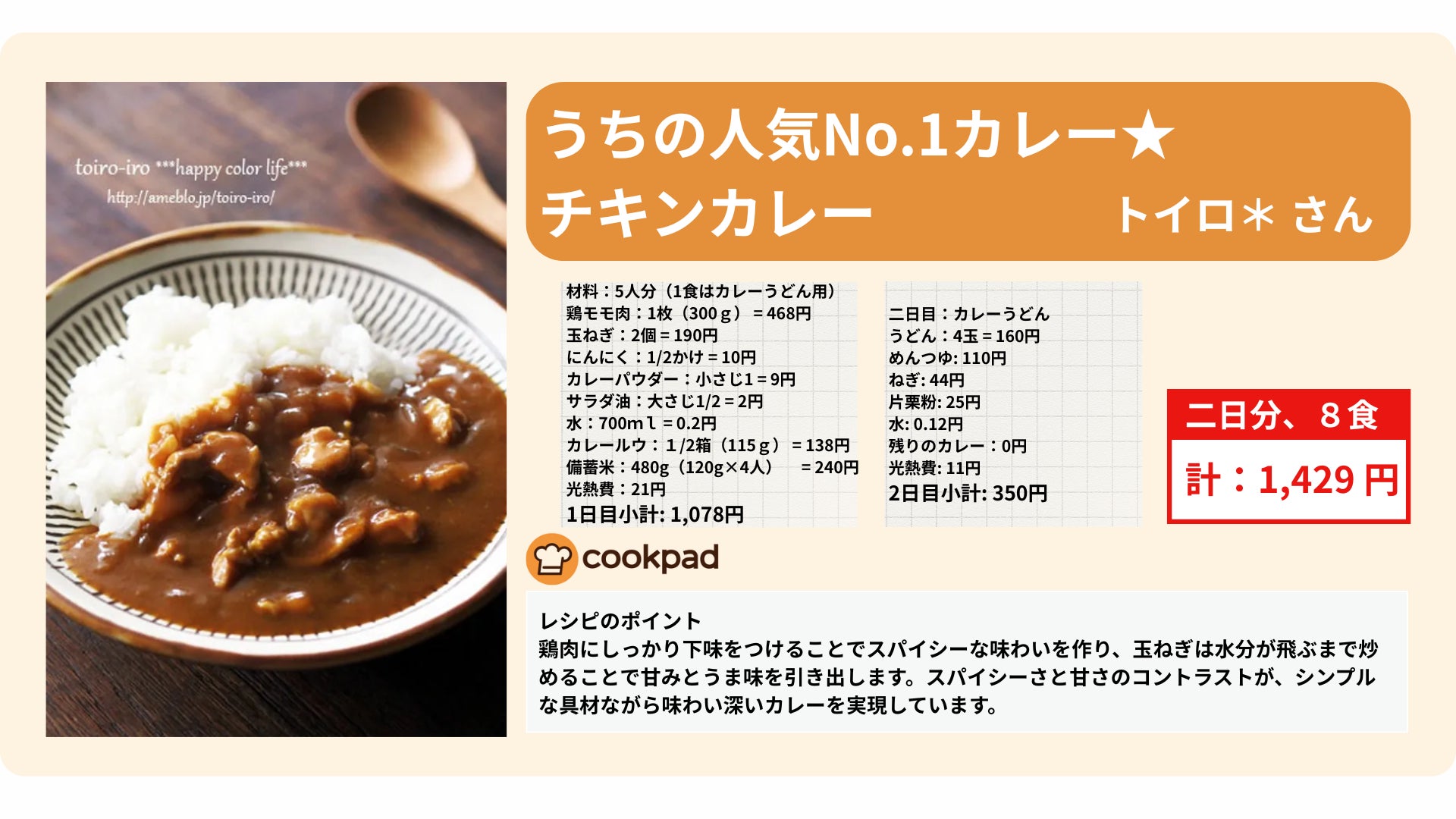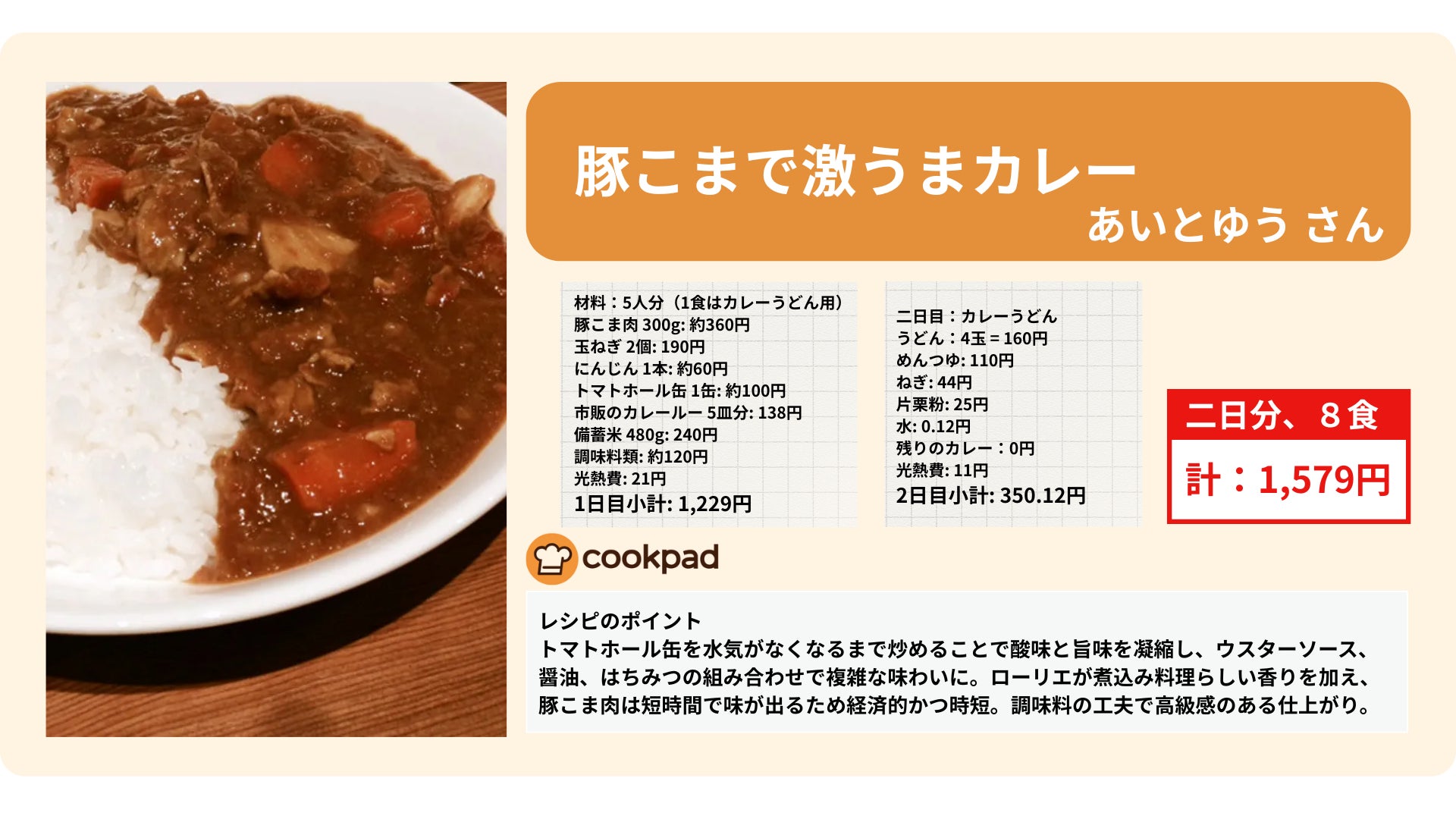 ◼︎二日目はカレーうどんリメイク78%、クックパッドの検索も3年で66%増加、合計6食1,500円