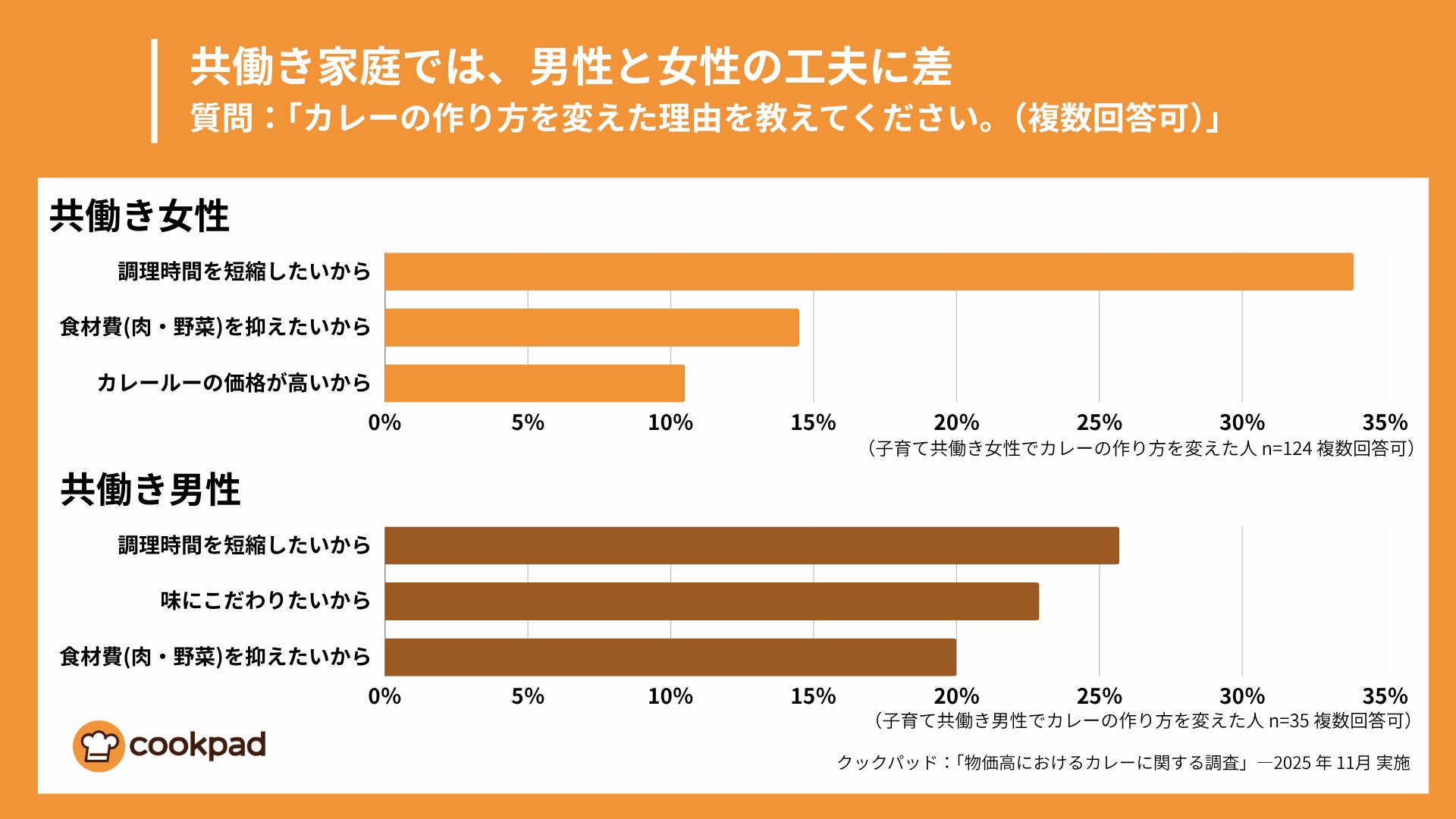 この1年でカレーに何らかの工夫をした人は86.7%(n=855)に達し、そのうち68.6%(n=741)が頻度を維持しています。特に、共働きで子育て中の家庭に限ると、女性は時短を最優先しており男性は時短と味、経済性が拮抗していることがわかります。