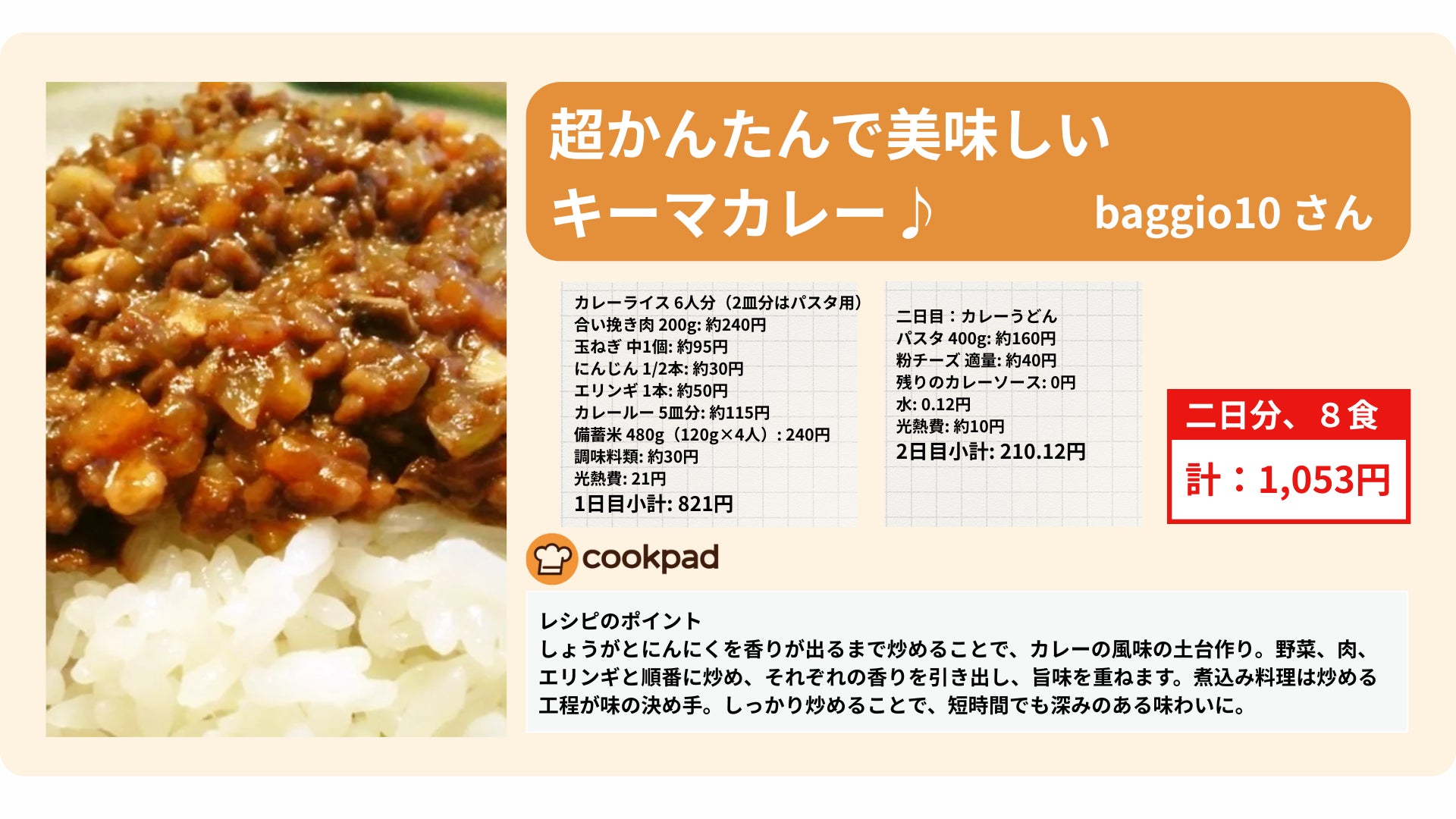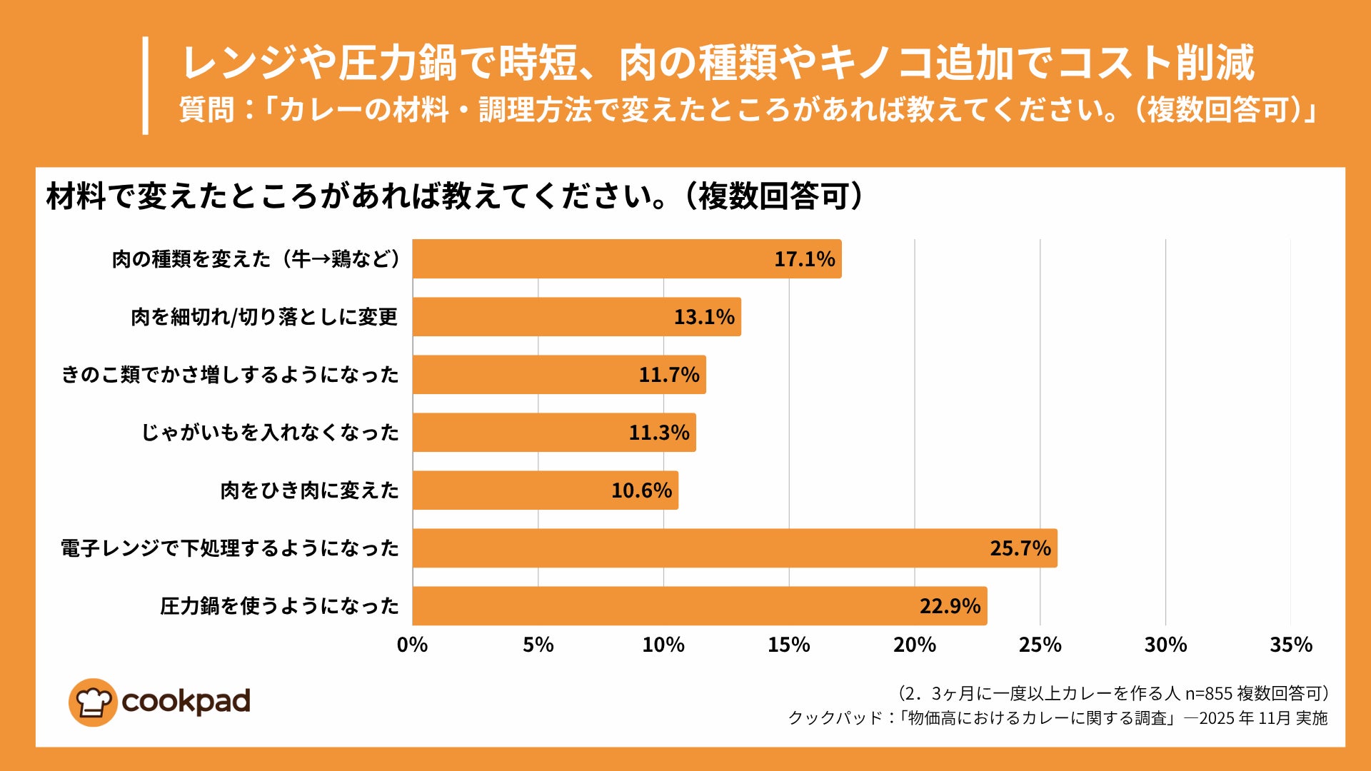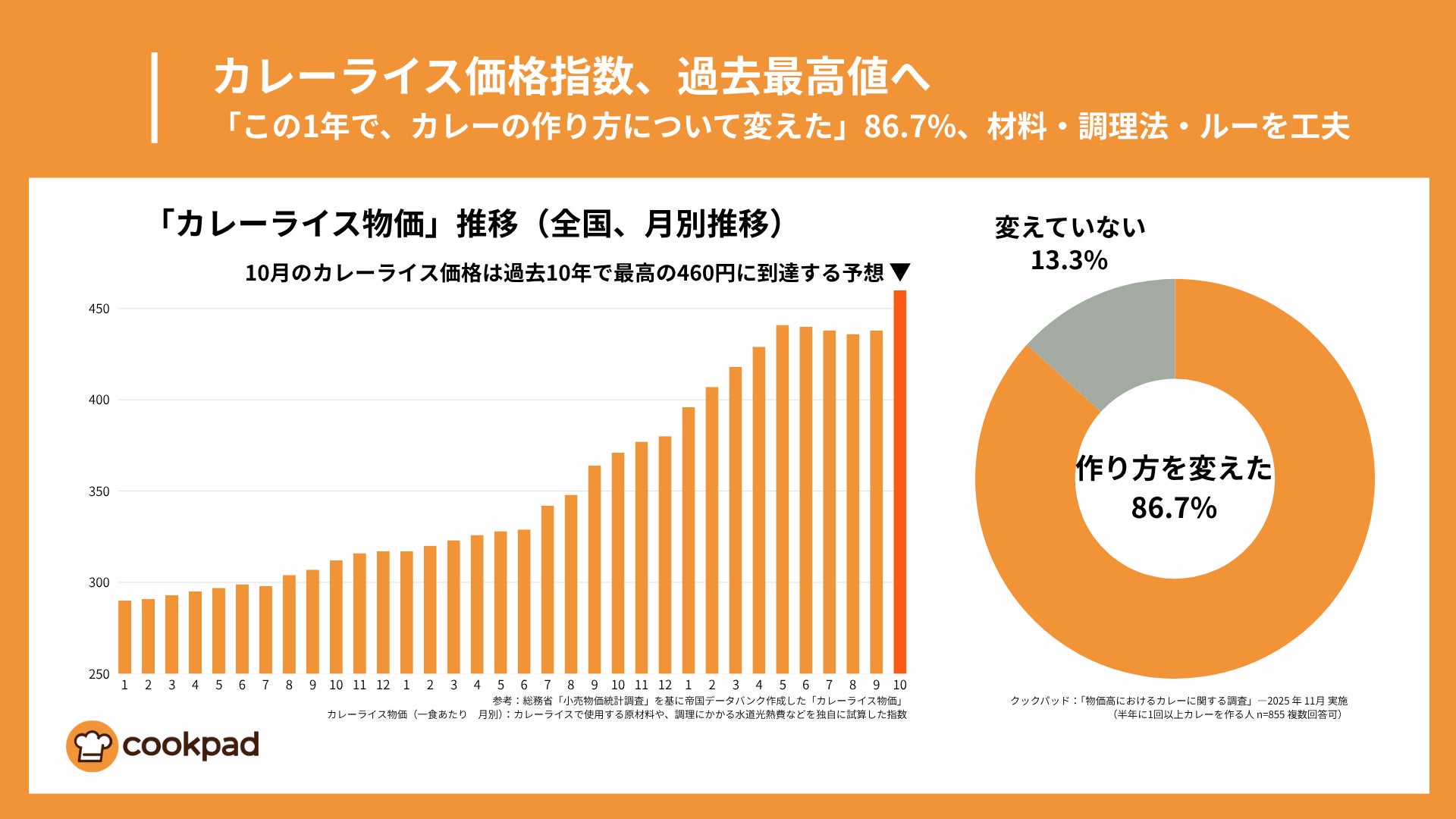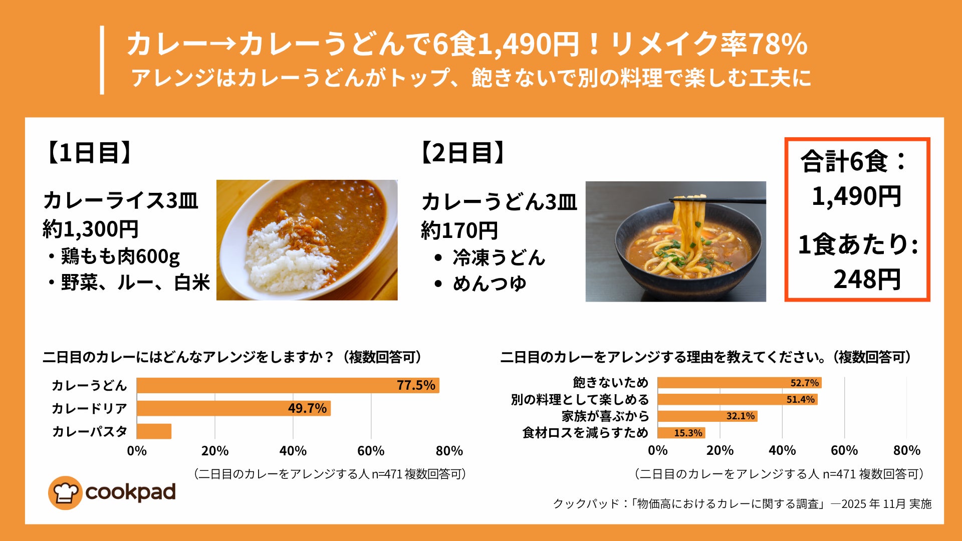 クックパッド株式会社(本社:東京都目黒区、代表執行役:佐野陽光)は、普段カレーを作る人を対象にカレー調理に関する実態調査を実施しました(n=855)。帝国データバンクが12月10日に発表予定のカレーライス物価指数(※1)は過去最高値を更新する見込みです。特にこの一年の物価高を受け、この1年で86.7%(741人/855人)が材料などの工夫をしており、当社の試算でも、2日目にカレーうどんにリメイクすることで3人家族2日6食を約1,500円で可能です。また、カレーが金曜に検索が増える背景には「週9回以上、女性1人が調理」という共働き世帯の負担があり、カレーが週末の限界夕飯を救っている実態が浮かび上がりました。