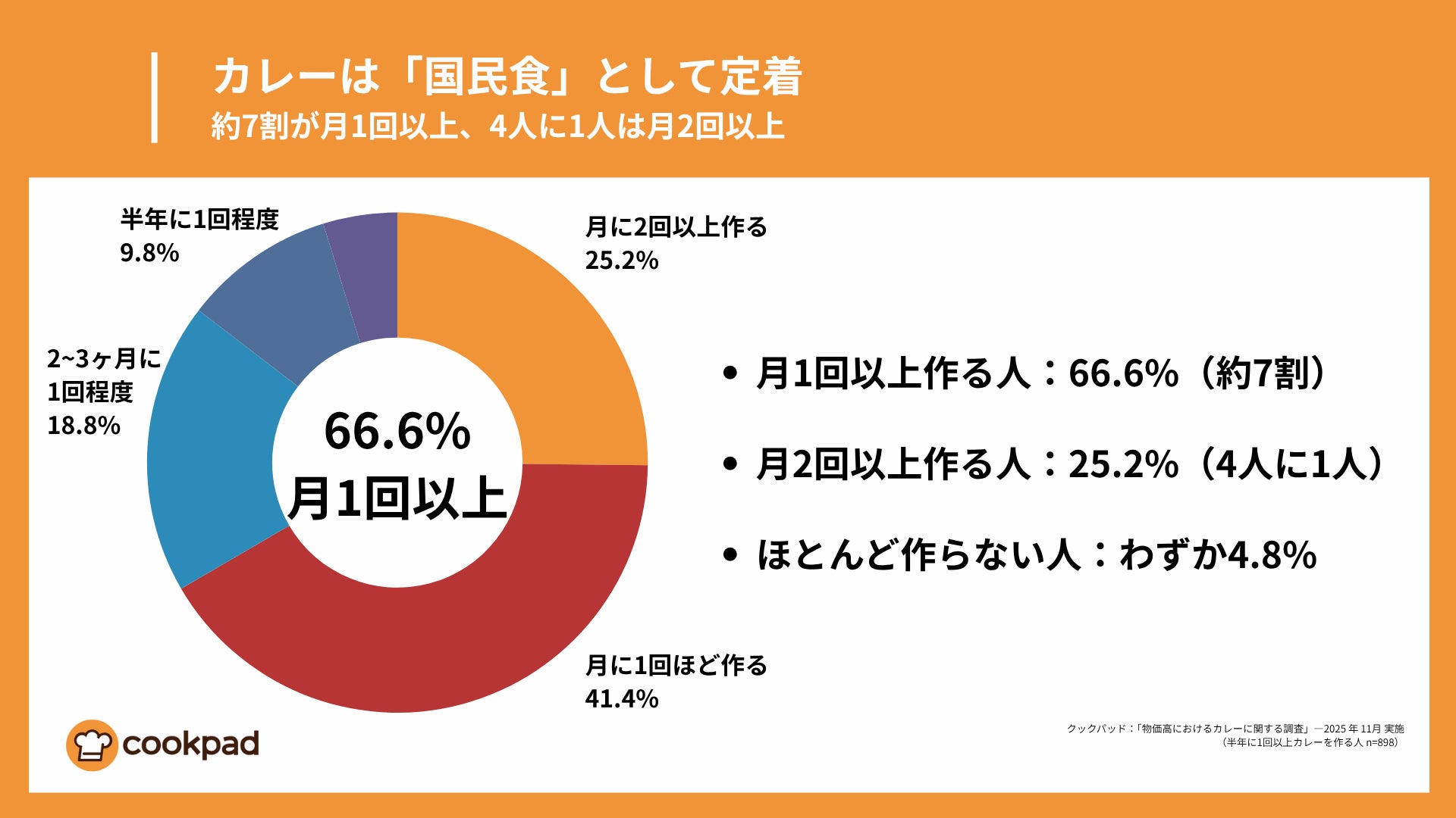 帝国データバンクが12月10日に発表予定のカレーライス物価指数は、過去最高値を更新する見込みです(※1)。物価高が続く中、カレーは国民食として家庭を支え続けており、月1回以上作る人は70%(月2回以上26%、月1回44%)に達しています。