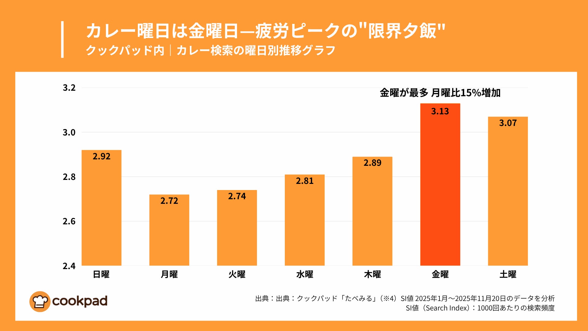 曜日別のカレー検索(※4)を分析すると、金曜日が月曜比で15%増加となる3.13でピークとなりました。週末前の疲労ピーク時に、「確実に作れる料理」としてカレーが選ばれています。
