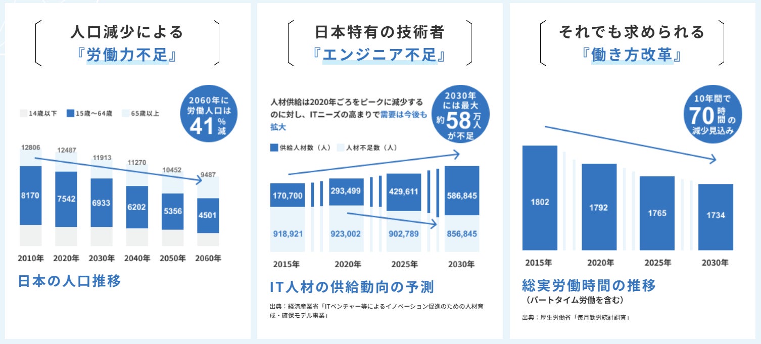 日本は「人口減少社会」を迎え、IT人材不足が深刻化しており、2030年には最大58万人のIT人材不足が予測されています(※1)。また、働き方改革の進展により労働時間も縮小傾向にあり、2030年には2015年比で年間70時間の減少が見込まれています(※2)。こうした中で企業が持続的に成長していくためには、「労働投入量の拡大」から「生産性の向上」へのシフトが不可避です。
