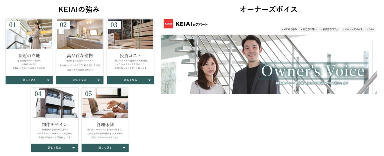 この度公開した不動産投資専用サイト「KEIAIのアパート」では、ビルダーとしての「当社の強み」から、実際にKEIAIのアパートで不動産投資を始められた方にインタビューした「オーナーズボイス」を掲載しています。さらに初めてのアパート経営をご検討されるお客様や既に希望するエリアや沿線が決まっているお客様に向けて、無料相談の申し込みができます。