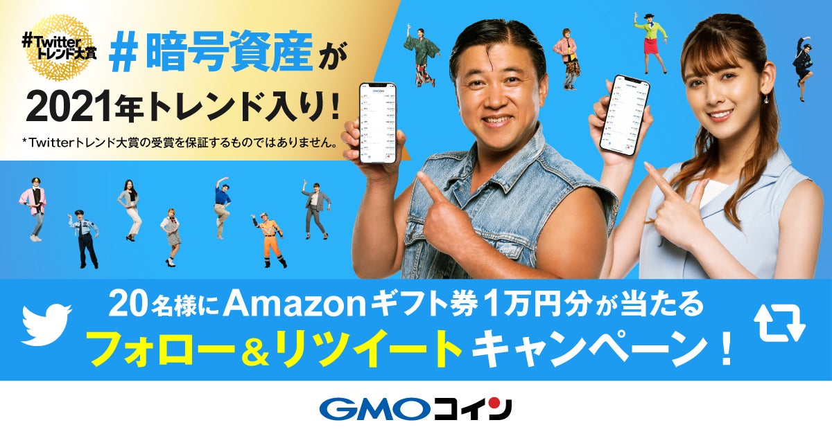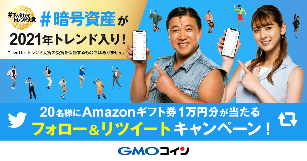 キャンペーン期間内にGMOコイン公式ツイッターアカウントをフォローし、対象ツイートをリツイートすると抽選で20名様にAmazonギフト券1万円分をプレゼントいたします。