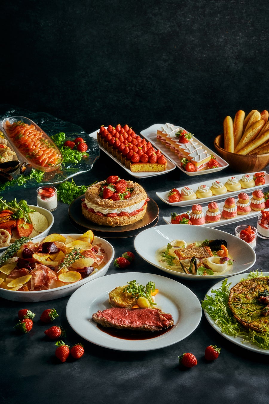 伝統的なビストロ料理をスタイリッシュにアレンジしたオールデイ ダイニング「フレンチ キッチン」では、選べるメイン料理に加え、前菜とスイーツをビュッフェスタイルでお好きなだけお楽しみいただけるディナープラン「ウィンター ストロベリー セミビュッフェディナー」をご提供いたします。ビュッフェステーションには、冬野菜のローストや、低温でゆっくり調理した鶏胸肉にゆずドレッシングを添えた一皿、生ハムとビーツをグレープフルーツで爽やかにまとめたサラダなど、季節感と食材の味わいを楽しめる前菜をご用意。さらに、自家製スモークサーモンやえびのマリネ、ムール貝、エスカベッシュなどを盛り合わせたシーフードプラッター、そして旬のいちごの魅力を詰め込んだスイーツなどが華やかに並び、全28種の豊富なラインナップをお楽しみいただけます。