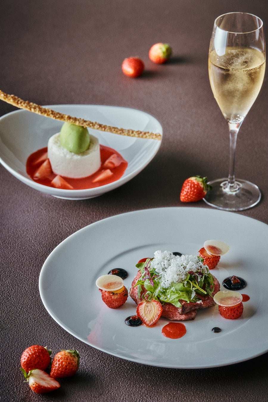 オーセンティックかつ旬の素材を生かしたモダンなイタリアン カフェ「フィオレンティーナ」では、前菜からパスタ、メイン、ドルチェまですべてに旬のいちごをふんだんに使用した特別ディナーコースをご用意いたします。コースは、いちごのやさしい甘みを引き立てたストロベリーヴィネグレットソースを、フレッシュいちごと色とりどりの野菜、ブッラータチーズと合わせるサラダからスタート。パスタには、いちごとビーツを練り込んだ鮮やかな赤色の生地で、天使の海老を包み込む自家製のラビオリをご用意。芳醇でコク深いアメリケーヌソースとともにお楽しみいただけます。メインディッシュには、イタリア トスカーナ地方発祥の薄切りのステーキ「タリアータ」をいちごの酸味を活かした特製ソースを添えてご提供いたします。絶妙な火入れで国産牛サーロインのやわらかな食感と上質な旨味を引き出すシェフ自慢の逸品です。ドルチェには、なめらかなリコッタチーズムースと香ばしいピスタチオアイスクリーム、甘酸っぱいストロベリースープで織りなす一皿をお楽しみください。