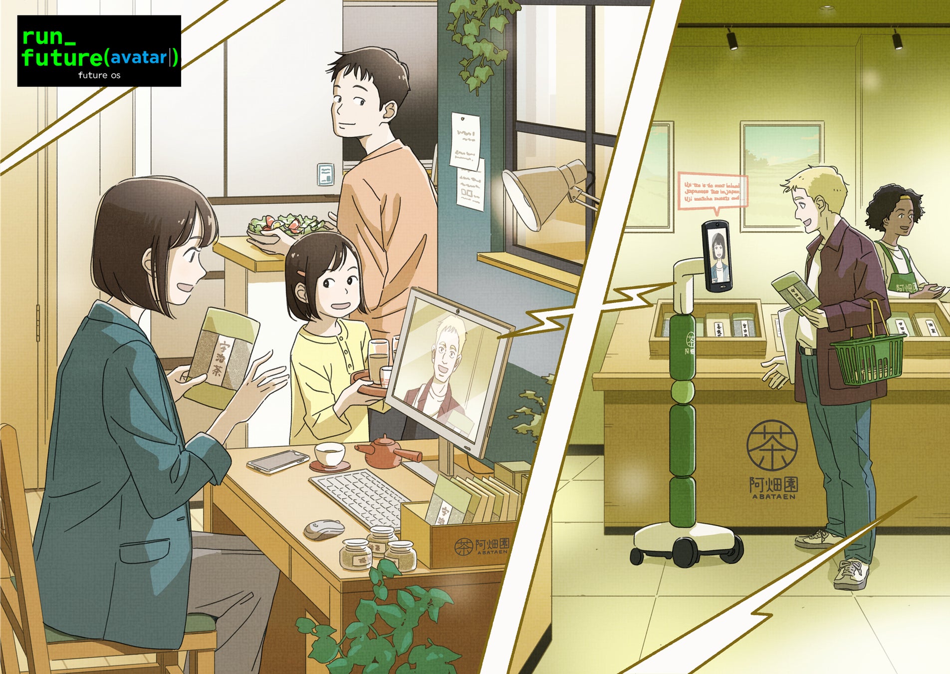 本作品は日本の家庭から海外の日本茶専門店へとつながる、コミュニケーションAIロボットnewmeを介した接客のワンシーンを描画。テクノロジーが“遠くにいる誰かと働くこと”を日常に変えていく、そんな未来の形を家庭の温かさと共に表現。家庭での日常の光景や、接客にあたる会話の表情には、デジタルと人の営みが自然に溶け合う未来への思いが込められています。みずす氏による柔らかな筆致で、「働く」と「暮らす」のあいだにある新しい生活を描いた作品です。