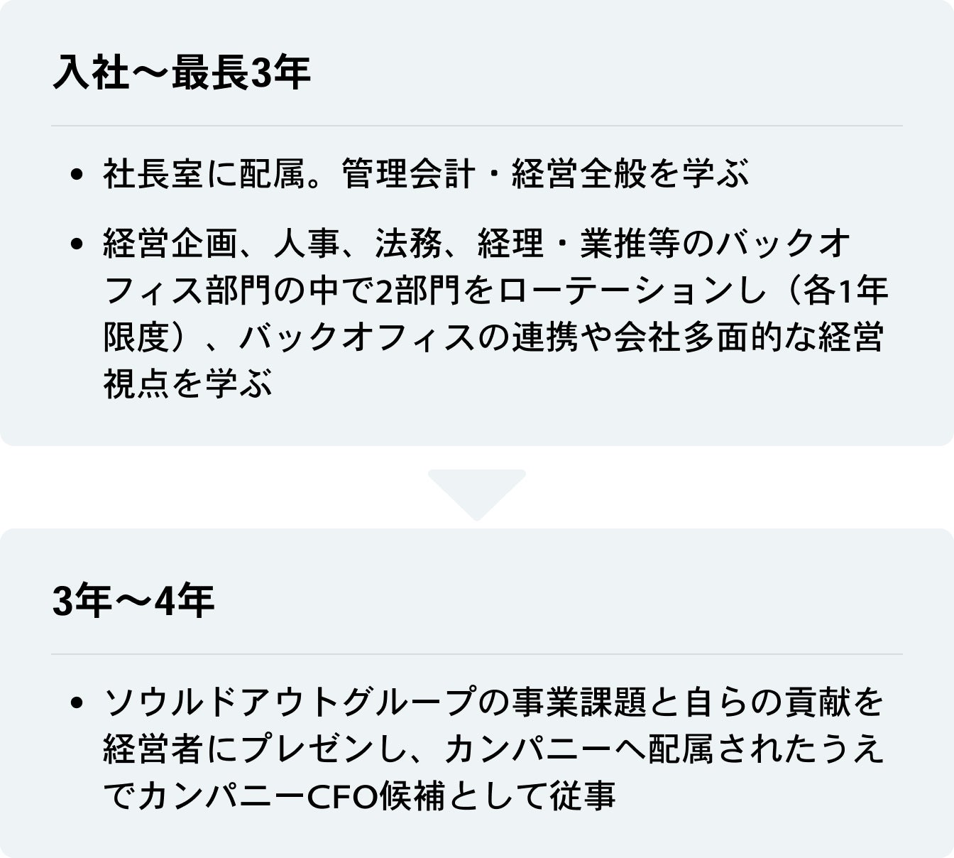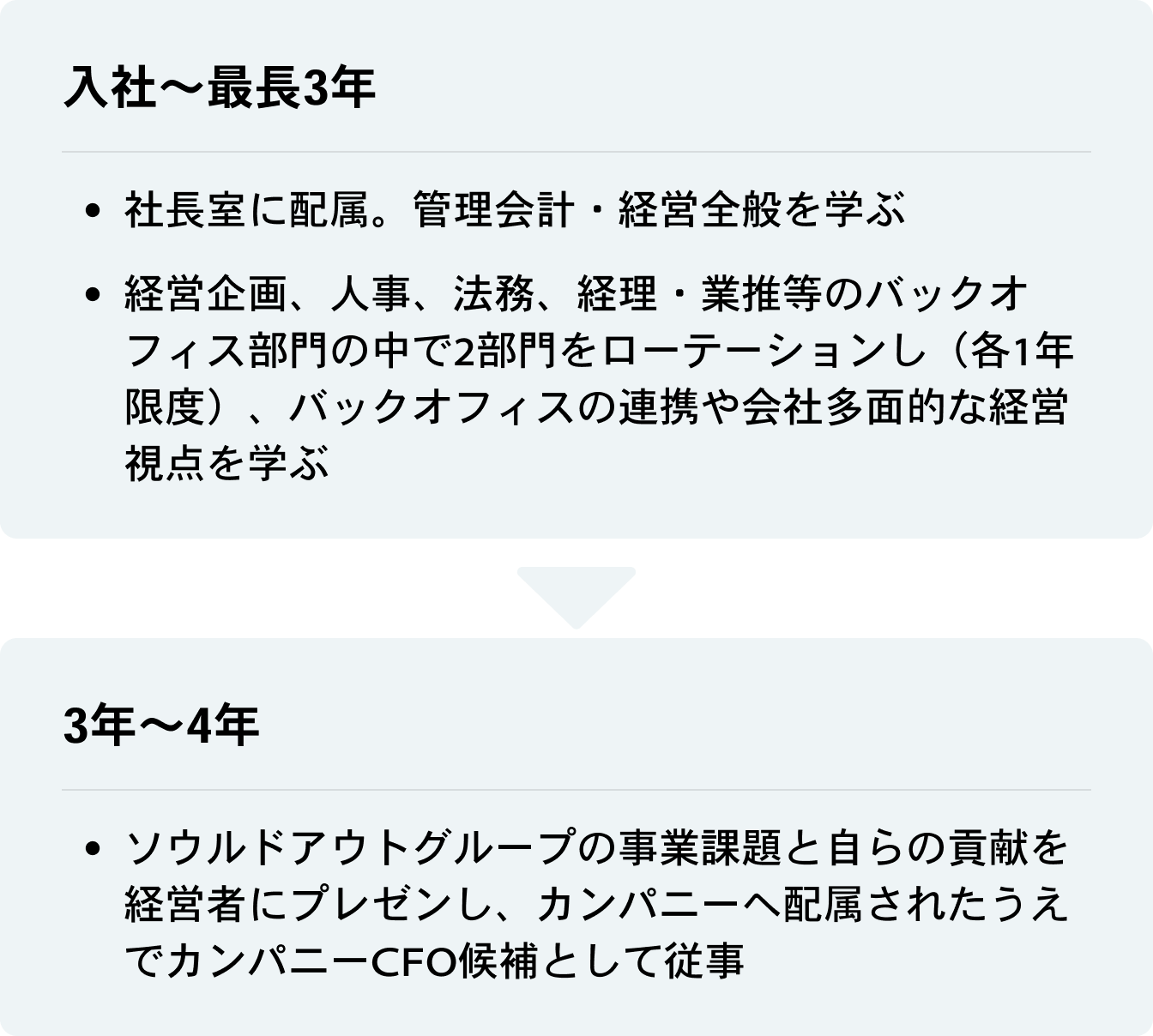 管理部門配属スタートのメリットは、経営者の参謀として全事業を俯瞰的に見れ、企業の成長戦略や様々な業界のビジネスモデルを理解できること。そして将来、広告実務に携わるときに、経営視点を持って、お客様に対峙できることだと考えています。このようなキャリアパスを経て、将来のソウルドアウトグループをリードして頂くことを期待しています。