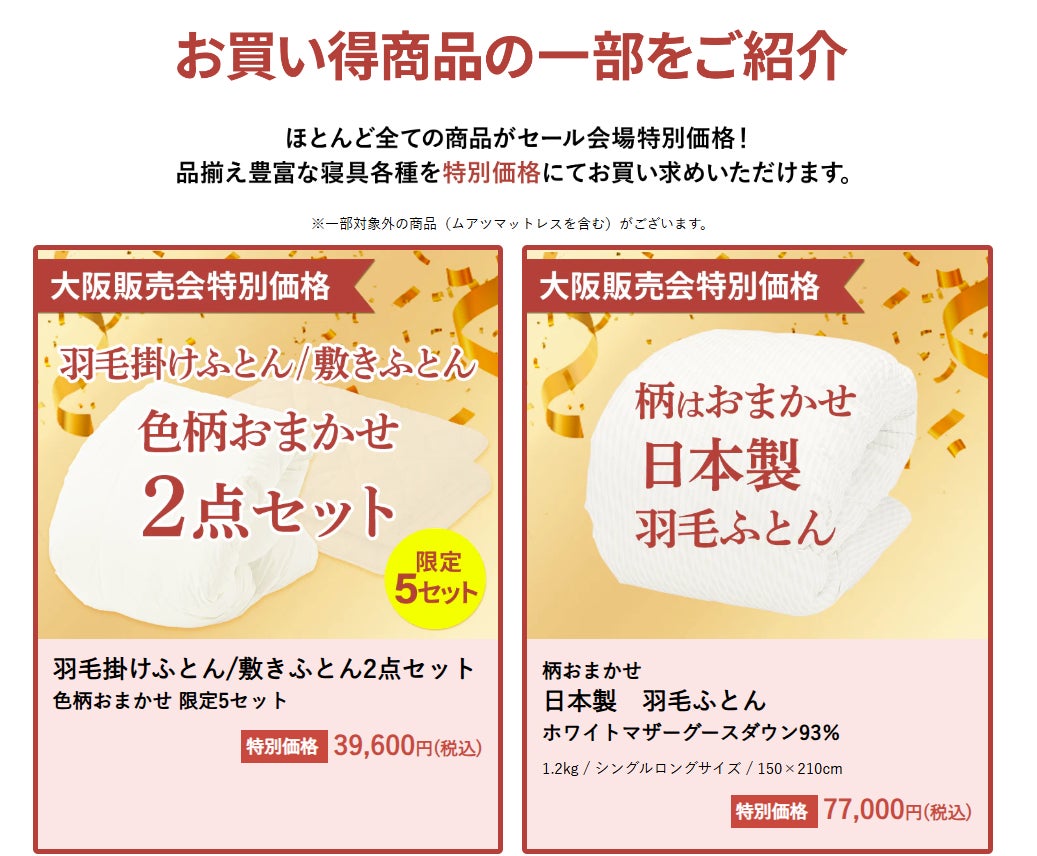 肌寒さが残りながらも、日差しに春を感じるこの季節は、眠る環境を見直す絶好のタイミング。本セールでは旧柄の羽毛ふとんを初めとした高品質な寝具を大阪ショールーム限定の特別価格でご提供いたします。春の寝具選びをお考えの方は、ぜひ、この機会をお見逃しなく。