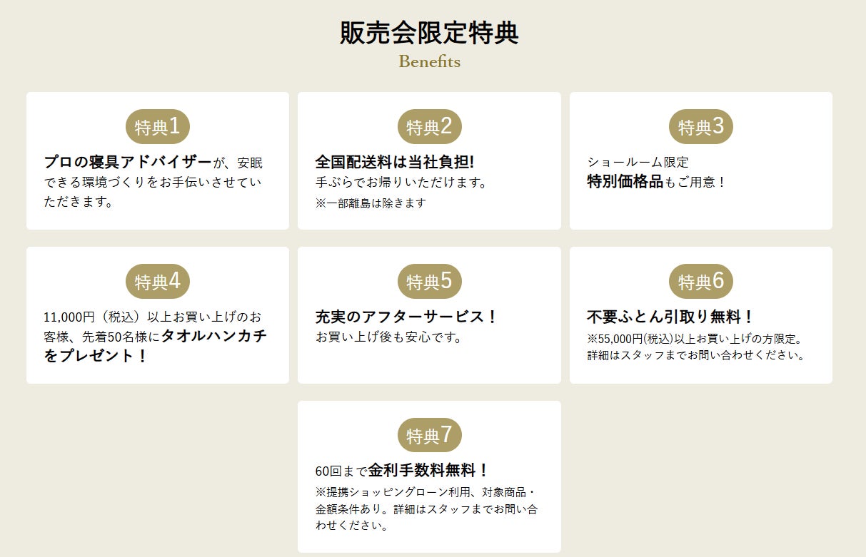 実際に手に取り、横になり五感で選べるのはショールームならでは。55周年を迎えるロングセラーMuAtsu(ムアツ)マットレスをお試しいただけるのはもちろんのこと、販売会限定の7特典もご用意してお待ちしております!