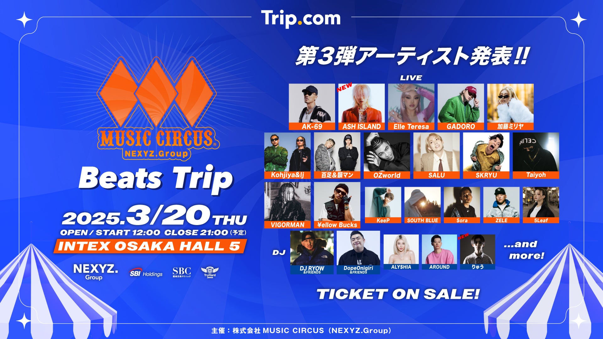 株式会社TryHard Japan(大阪市中央区)は、2025年3月20日(木・祝)にインテックス大阪5号館で開催される音楽フェスティバル「MUSIC CIRCUS -Beats Trip-」の第3弾出演アーティストを発表いたします。