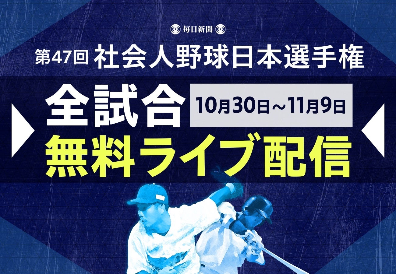 毎日新聞社は、大阪市の京セラドーム大阪で10月30日(日)に開幕する「第47回社会人野球日本選手権」(毎日新聞社、日本野球連盟主催)を全試合無料でライブ配信します。日本選手権のライブ配信は今年で4回目。試合後に公開する「見逃し配信」で、注目のゲームをプレーボールからゲームセットまで丸ごと振り返ることができます。