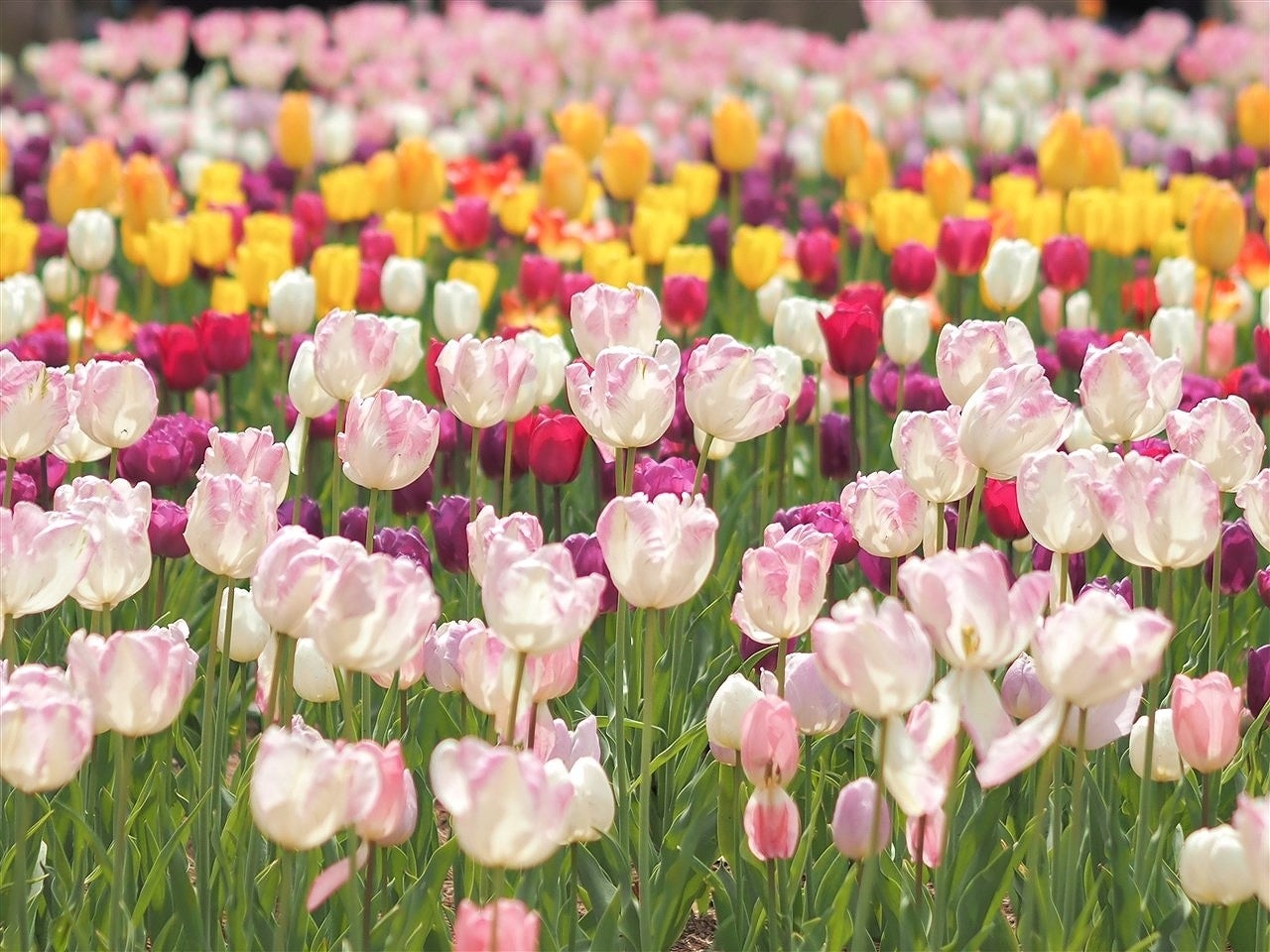 花畑のどこからでも多品種のチューリップを楽しんでいただけるような配色のデザインになっています。花畑の全景としてのグラデーションをお楽しみください。