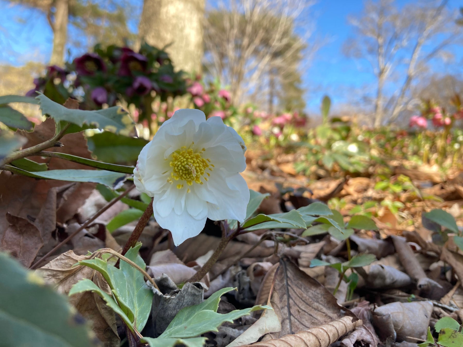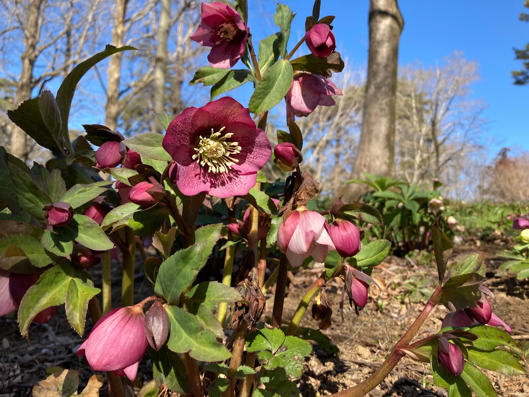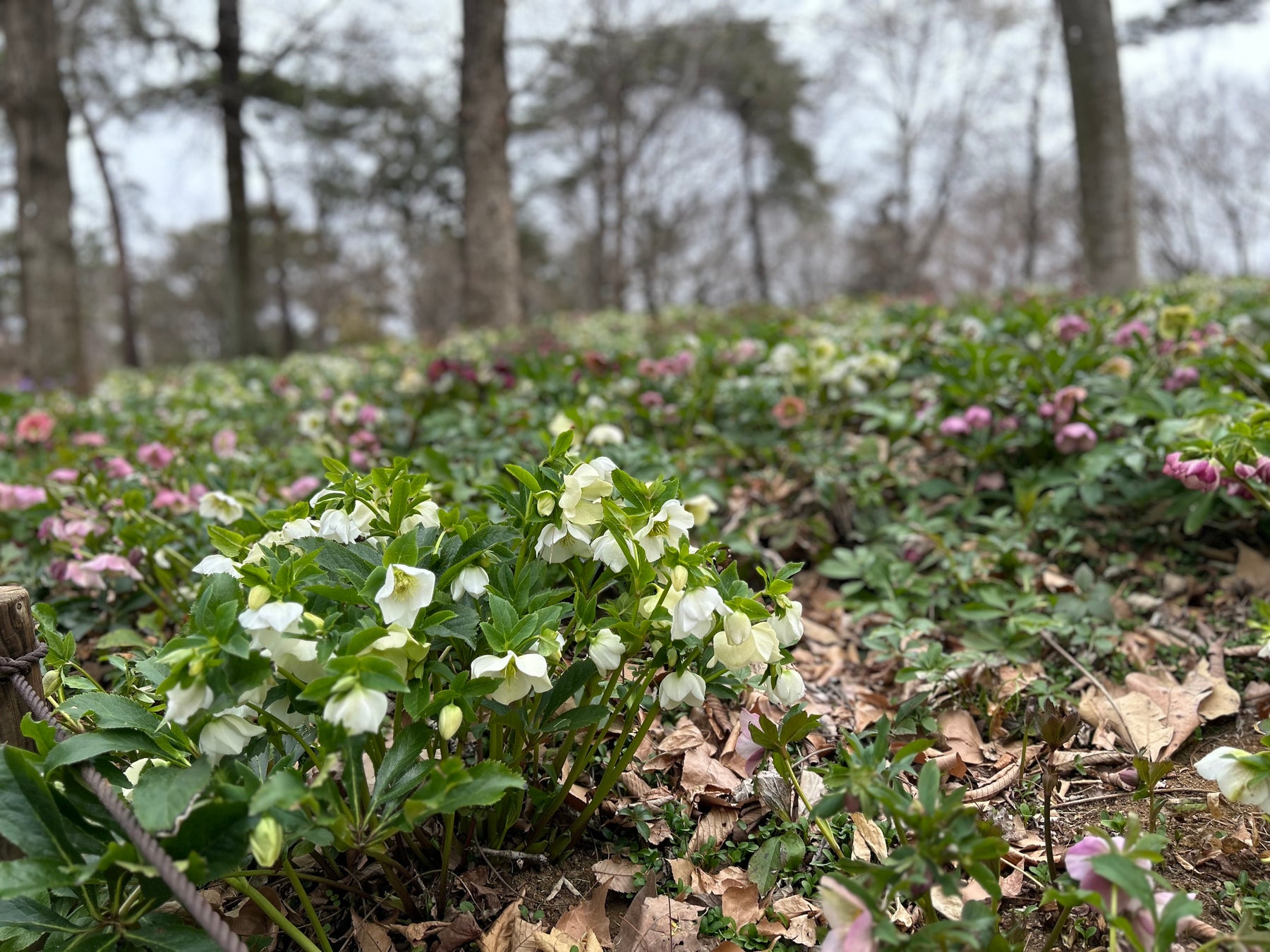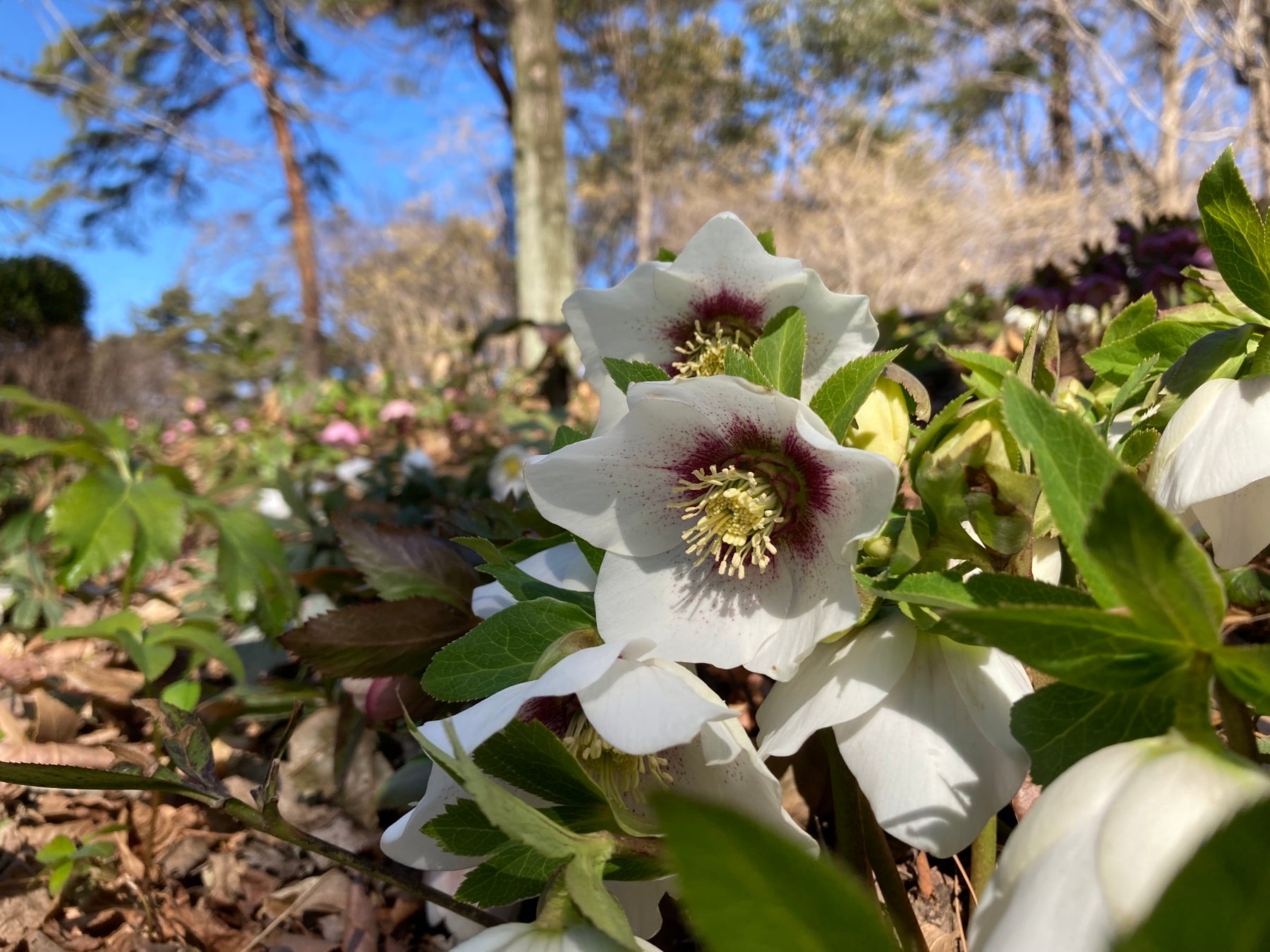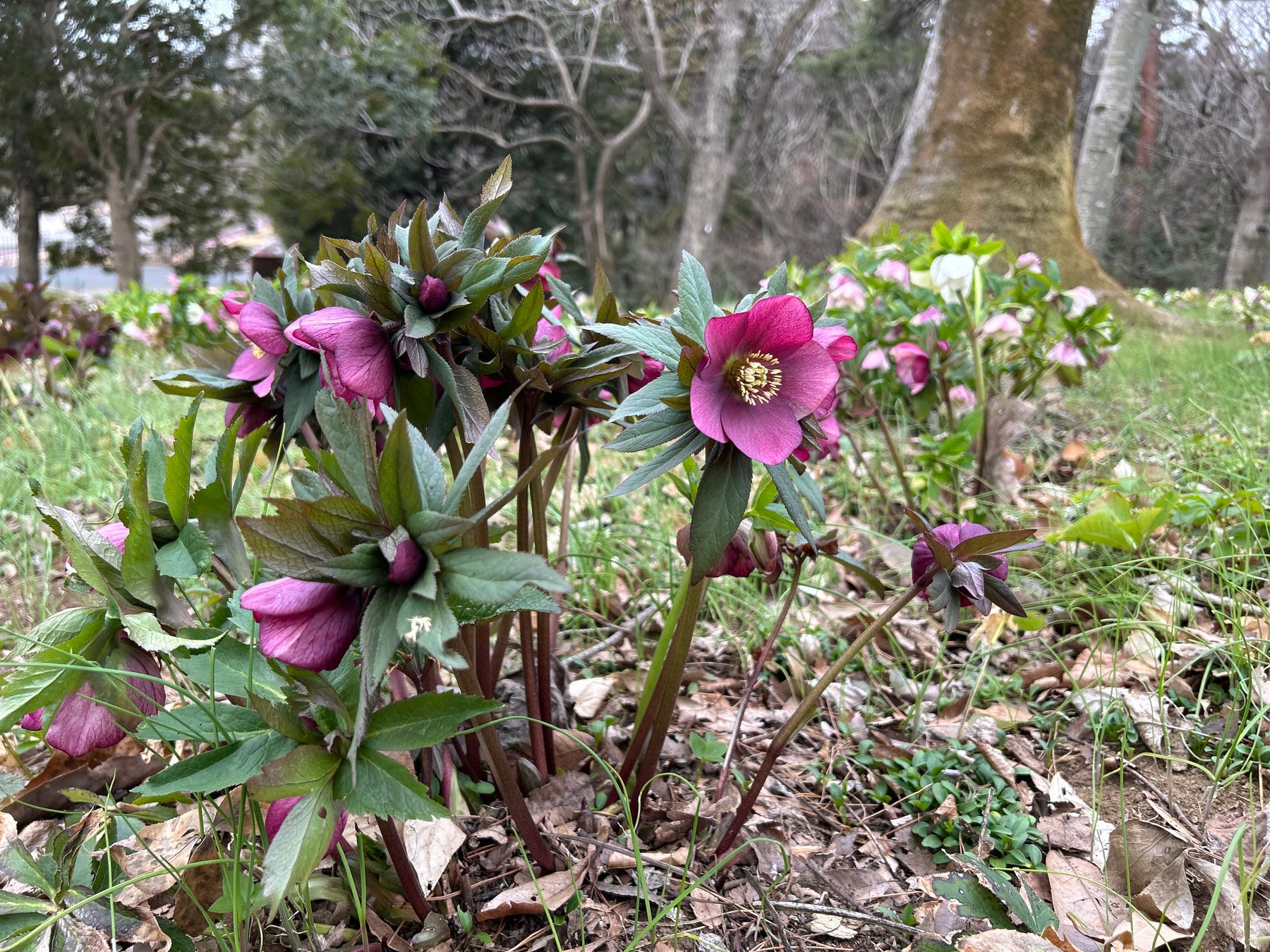 早咲きチューリップが咲く公園・庭園樹園の一角では、「クリスマスローズ」が最盛期を迎えています。寒さの影響で昨年よりも最盛期が2週間ほど遅れましたが、花数の多い大株のクリスマスローズが、冬の面影を残す園内に彩りを添えています。