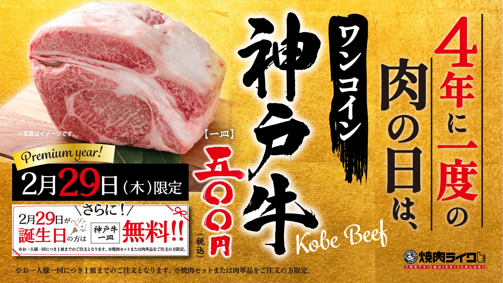【4年に1度の肉の日】焼肉ライクで「神戸牛」が500円で楽しめるチャンス!さらに、うるう年誕生日の方には「神戸牛」無料プレゼント!2月29日(木)全国85店舗で開催