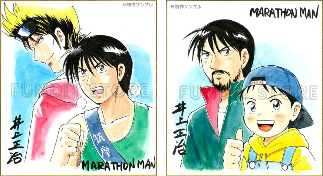 今回は、「マラソンマン」「POLICEMAN」「JUMP MAN〜ふたりの大障害〜」等を代表作に持つ井上正治先生によるセミオーダーのカラーイラスト色紙販売を開始いたします。また、キャラクターの数や作画イメージなどのリクエストに応えて描き下ろすセミオーダーのカラーイラスト色紙に加えて、「マラソンマン」から各限定1枚の販売となる完成品カラーイラスト色紙(2種)の2つの商品をラインナップに追加しております。
