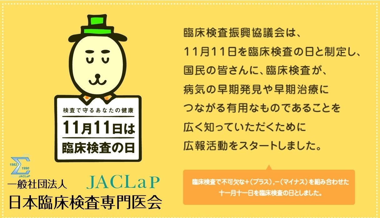 臨床検査が病気の早期発見や早期治療につながる有用なものであることを広く知っていただくためにスタートしました。臨床検査で不可欠な+(プラス)、-(マイナス)を組み合わせた11月11日を記念日としています。