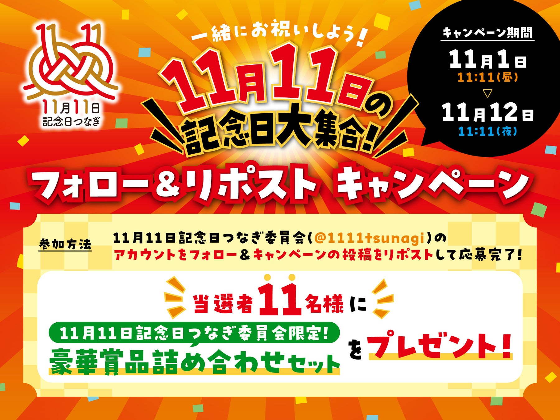 「11月11日記念日つなぎ委員会」の豪華賞品詰め合わせセットが11名様に当たるXキャンペーンを開催します。