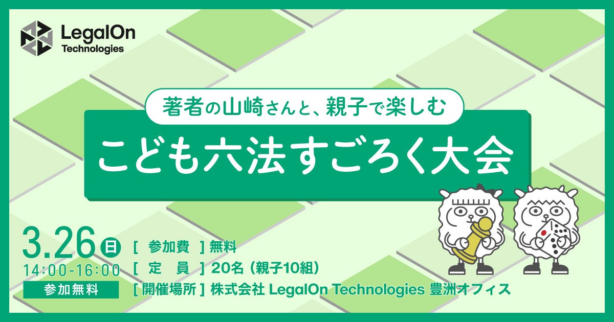 「こども六法すごろく大会」は、子どものころから知っておきたい法律に関する○×クイズを解いたり、イベントゲームにチャレンジしながら、日本における6つの主要な法典である「六法」をすごろくを通じて体験できるオフラインイベントです。大人でも難解な「六法」を親子で楽しく学んでいただくことで、実は身の回りに法律の概念が存在することを知り、法律をもっと身近に感じてほしいという想いから、本イベントの開催に至りました。当日は筆者の山崎 聡一郎氏と「こども六法スクール」の講師をお招きし、解説を交えながらすごろく大会を楽しんでいただきます。