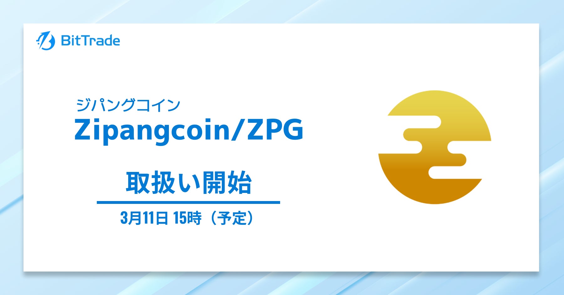 ビットトレード株式会社(所在地:東京都港区、代表取締役社長:関 磊、以下「ビットトレード」)は、暗号資産ジパングコイン(Zipangcoin/ZPG)の販売所での取扱いを3月11日(火)(予定)より開始することをお知らせいたします。