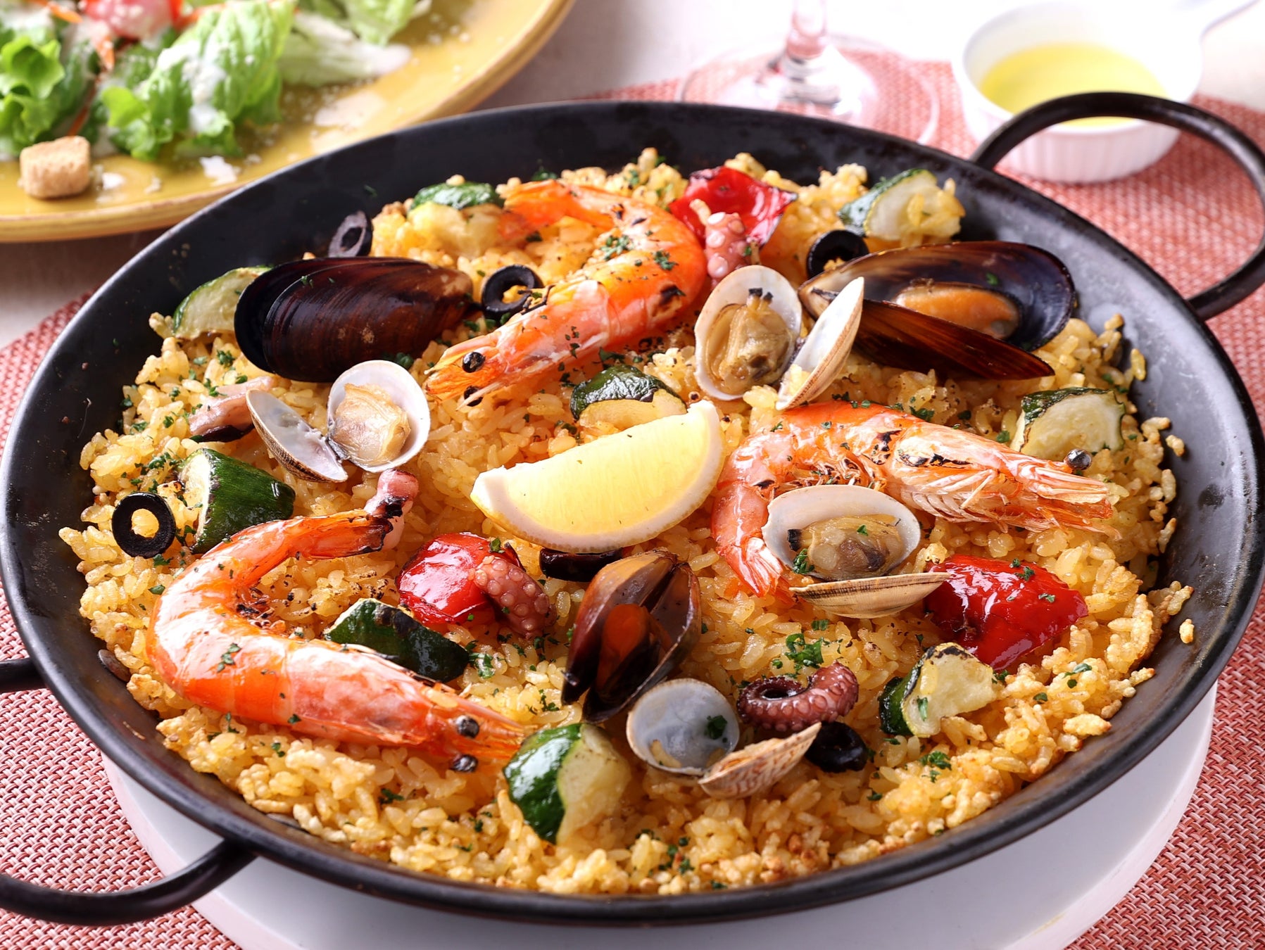 彩り豊かな魚介や野菜、サフランがほのかに香る鮮やかな色合いのお米。地中海らしさ感じる贅沢な一皿です。