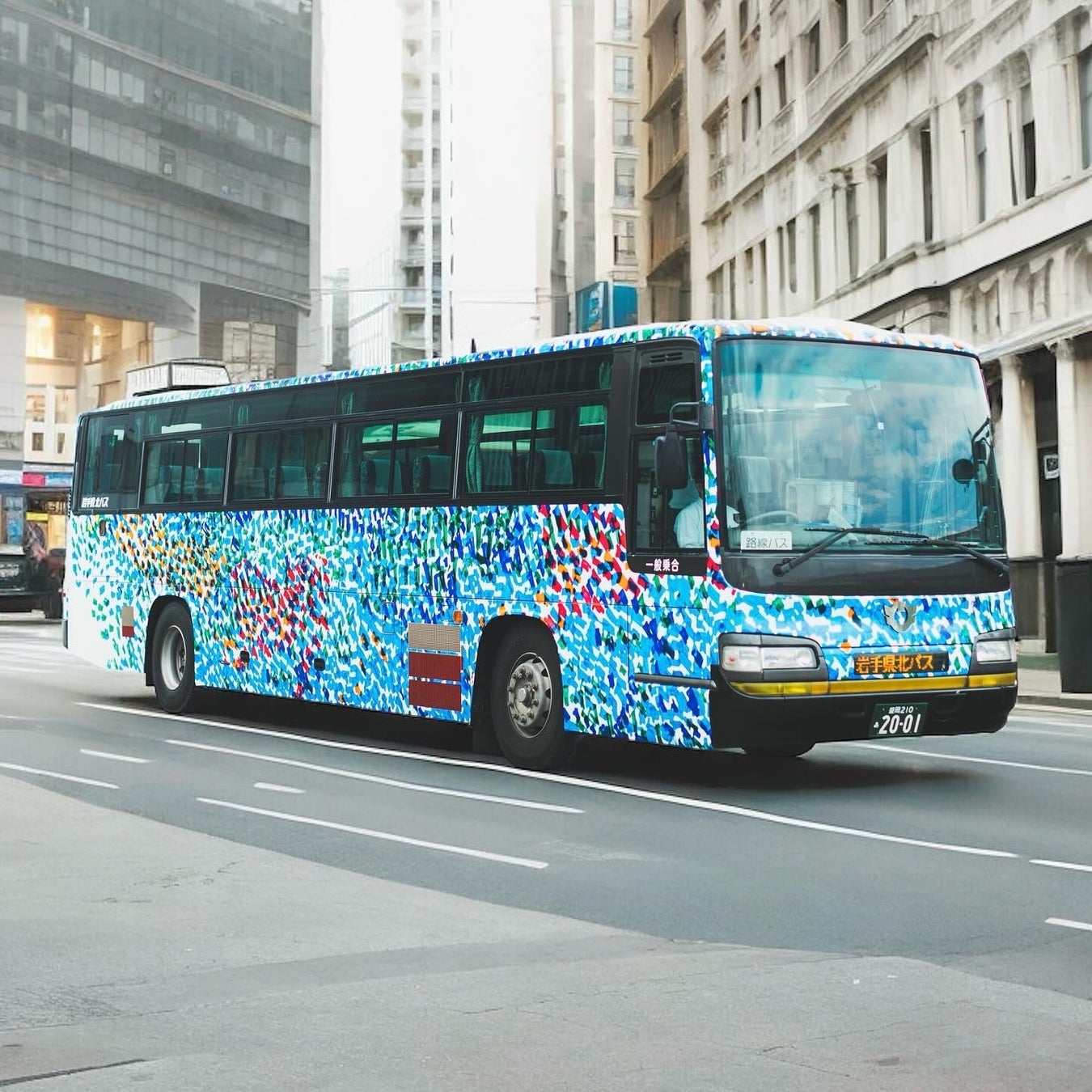 盛岡市内~近郊市町村で運行している「ヘラルボニーバス」。工藤みどり氏の「(無題)(青)」で彩られたバスは、作品の美しさだけでなく、街に暮らす人々の個性が受け入れられやすい空間を考えるきっかけとなっています。