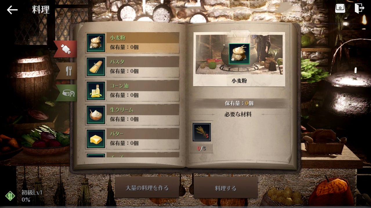 料理は、領地内の農場で品種改良された種を栽培もしくは家畜の収穫/と畜で獲得したアイテムを材料に利用できます。 一部材料はメディア商人会納品のお礼や、料理製作を通じて獲得できます。