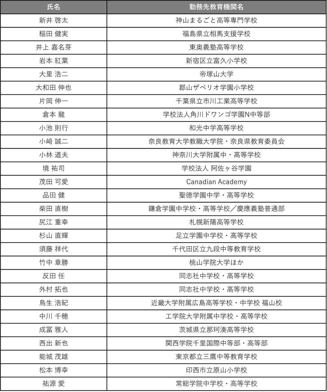 小学校3名、中高一貫校13名、高等学校5名、高等専門学校1名、大学3名、専門学校1名、特別支援学校1名、インターナショナルスクール1名、合計28名(氏名50音順、敬称略)