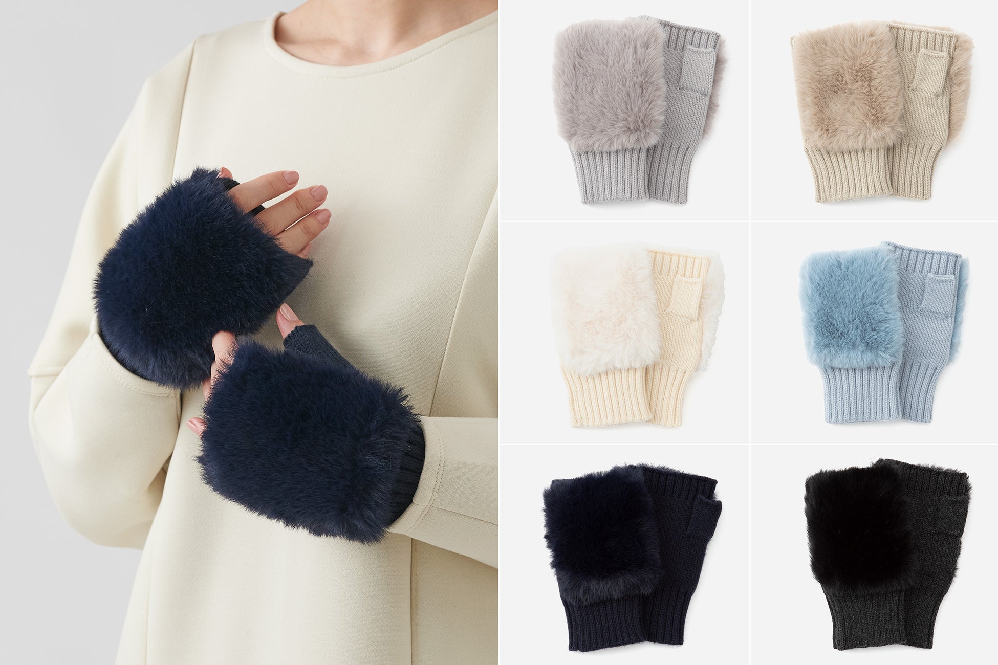 エコファー差込ティペットと同じふんわりしたファーを使用しているので、セットで合わせてお使いいただくのもおススメです。昨年同様ニット部分にはシアバター加工を施し、さらに今年は糸を変えることで肌触りにこだわっております。付けたままスマホ作業がしやすい指先が出るデザインで、冬の外出時のおしゃれにぴったりなアイテムです。