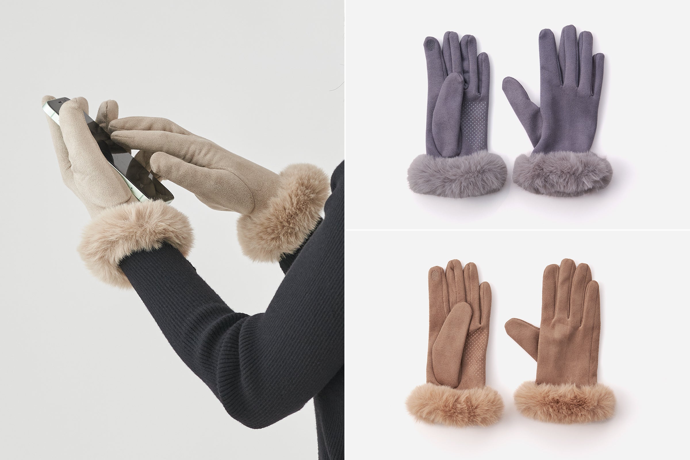 昨年販売したアイテムをベースに、手首にふんわりとしたファーをあしらい、さらに上品なデザインにリニューアルいたしました。フェイクスエード生地には、抗菌防臭加工を施しており、また手洗いが可能なので、衛生的にお使いいただけます。さらに、人差し指と親指はタッチパネル対応、手のひらにはすべり止めもついていおり、小さなこだわりがうれしいアイテムです。
