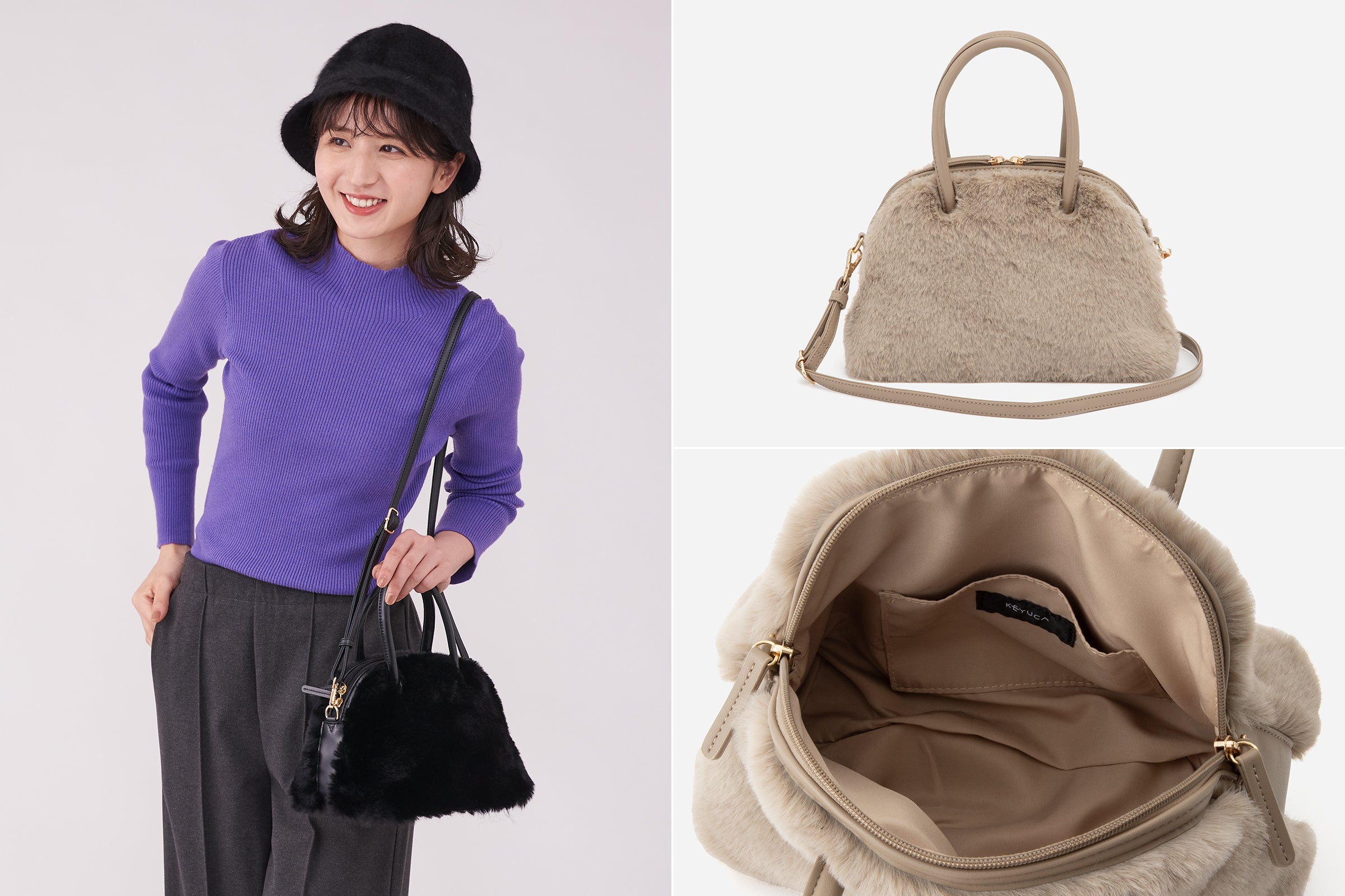肩掛け紐の取り外しが可能なので、シーンに合わせて手提げと肩掛けができる2WAY仕様。秋冬にぴったりなファー素材を使用し、普段のコーディネートに季節感をプラスしてくれます。見た目はコンパクトですが、長財布や500mlペットボトル、折りたたみ傘などの収納が可能です。